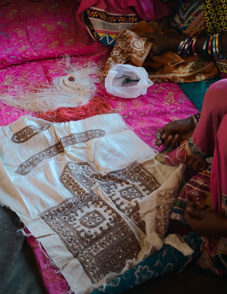 Over the past 800 years, many nomadic and semi-nomadic groups have made the desert region of Kutch their home. We work with two of these communities - Sindhi Memon and Meghwal. They live in northwest India and Pakistan and are known for their embroidery – a reflection of their cosmogony. Every different technique – stitch, motifs, and patterns – represents the diversity within their people, their unique culture, and identity.