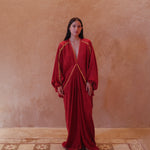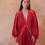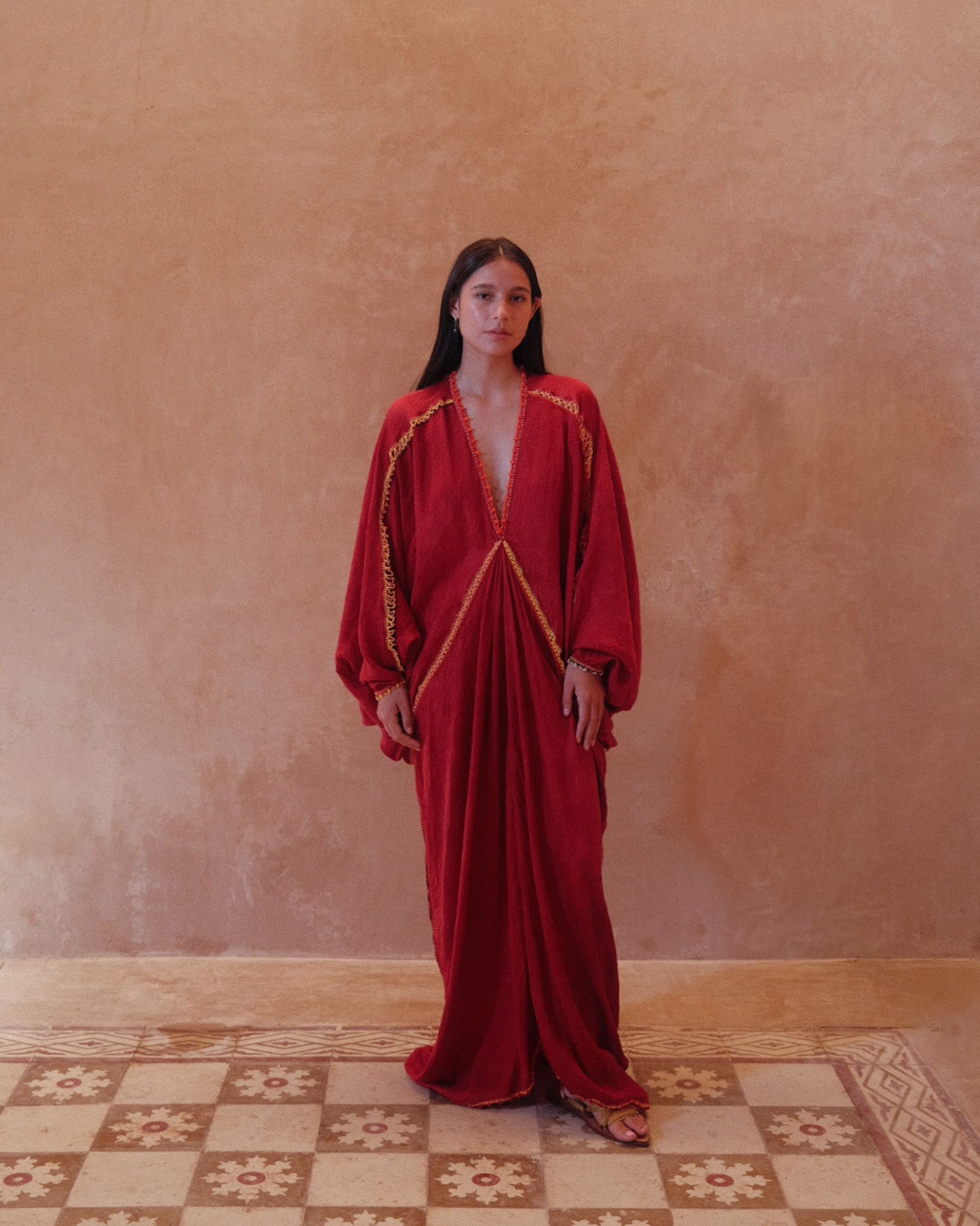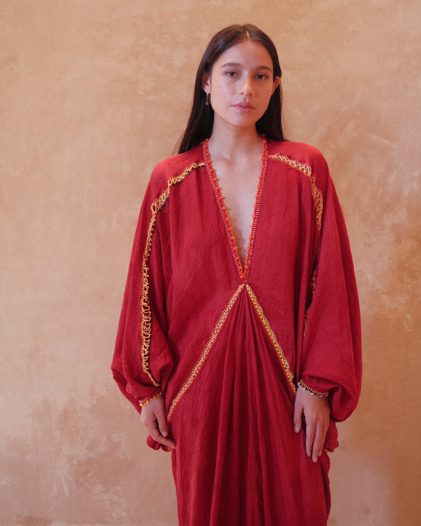 Cosima is new dress style. Inspired by the flutter and reach of a butterfly’s wings - the drape and fluidity of the Sari in India - the mystique and elegance of the Geishas of Japan. At the heart of it, the beauty and presence of women, something felt all over the world - and something we hope you’ll feel in this new style of kaftan. Crafted from almost 5 meters of natural dyed silk, expertly finished with crochet from Viki, we have a limited edition run of this new dress style. An open size, it effortlessly drapes on all body sizes and shapes and accentuates your body.