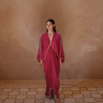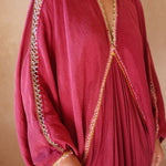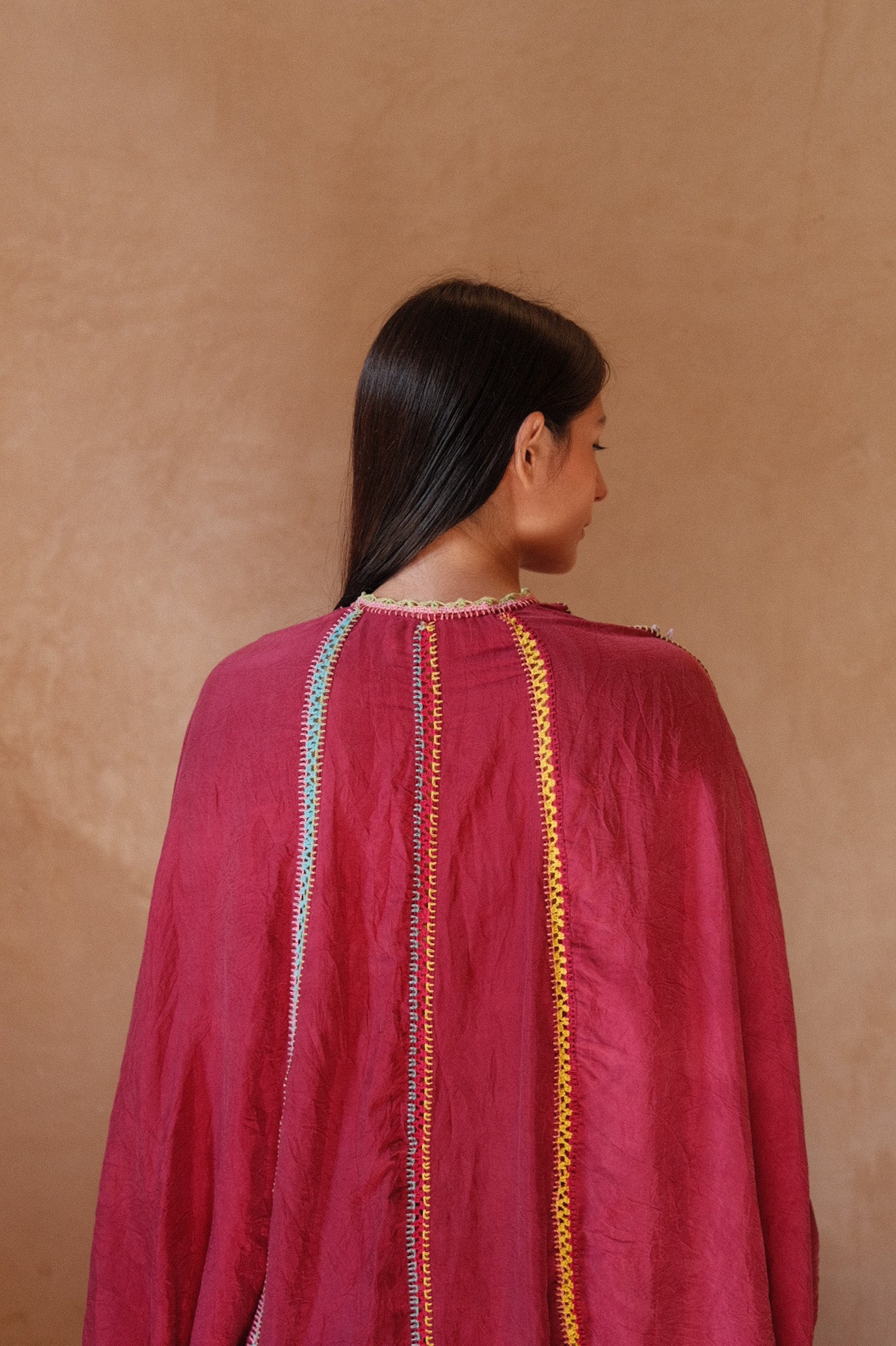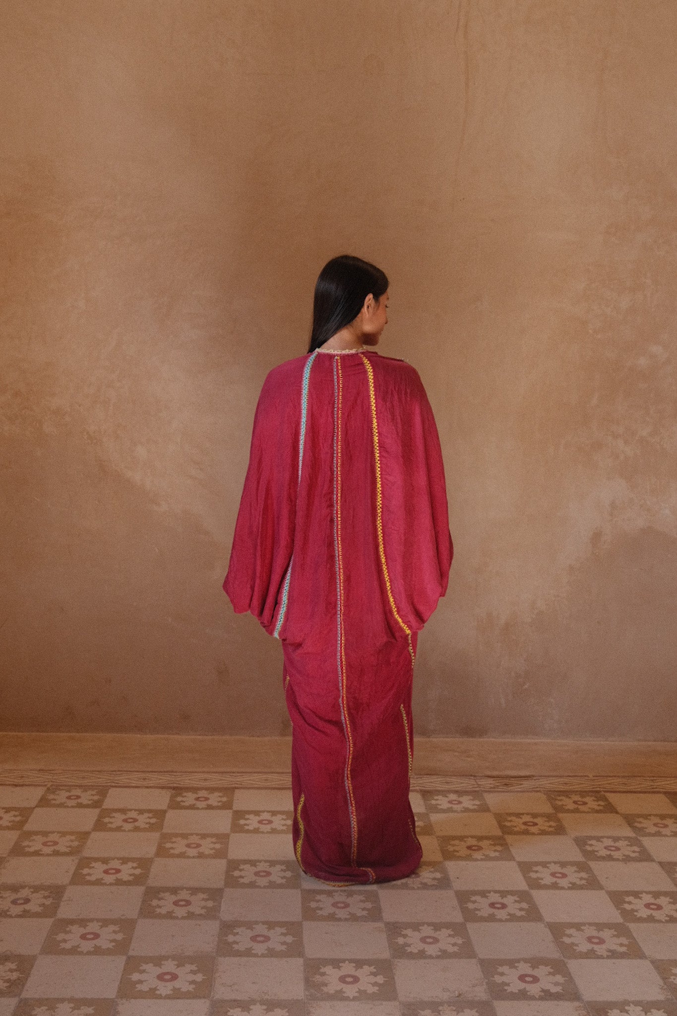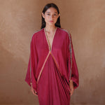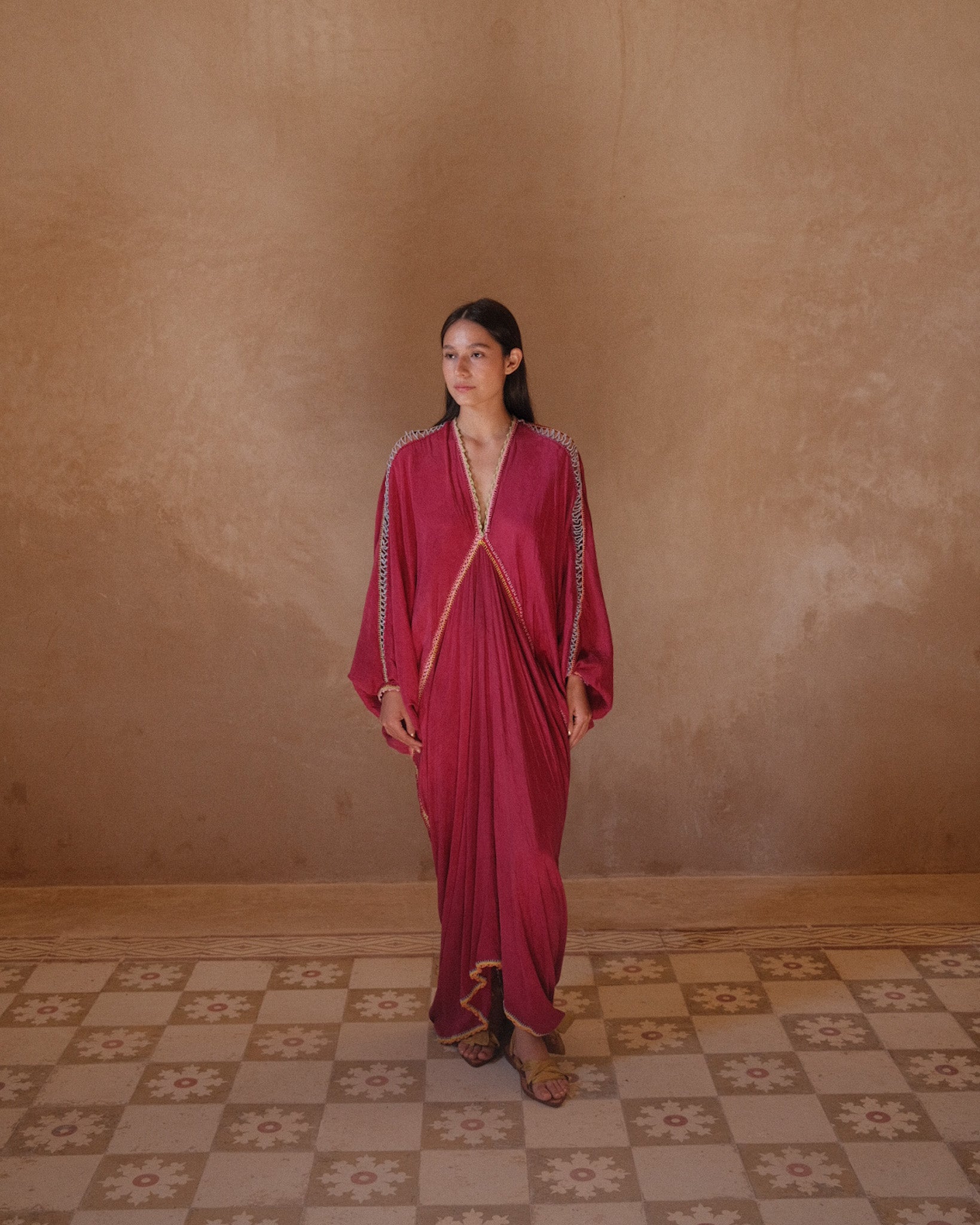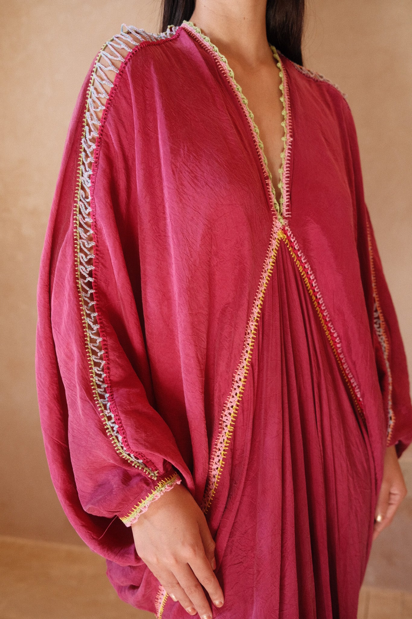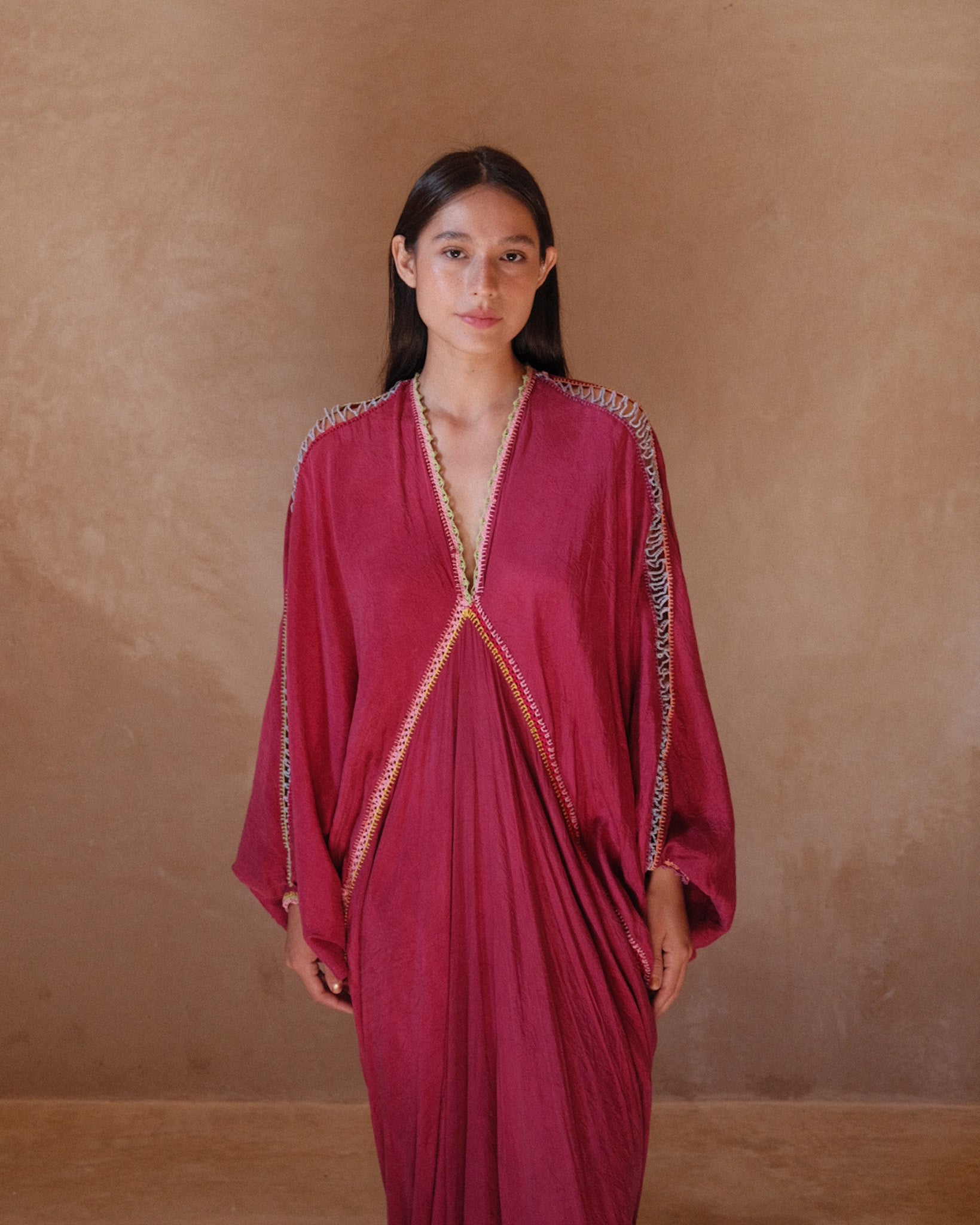 Cosima is new dress style. Inspired by the flutter and reach of a butterfly’s wings - the drape and fluidity of the Sari in India - the mystique and elegance of the Geishas of Japan. At the heart of it, the beauty and presence of women, something felt all over the world - and something we hope you’ll feel in this new style of kaftan. Crafted from almost 5 meters of natural dyed silk, expertly finished with crochet from Viki, we have a limited edition run of this new dress style. An open size, it effortlessly drapes on all body sizes and shapes and accentuates your body.