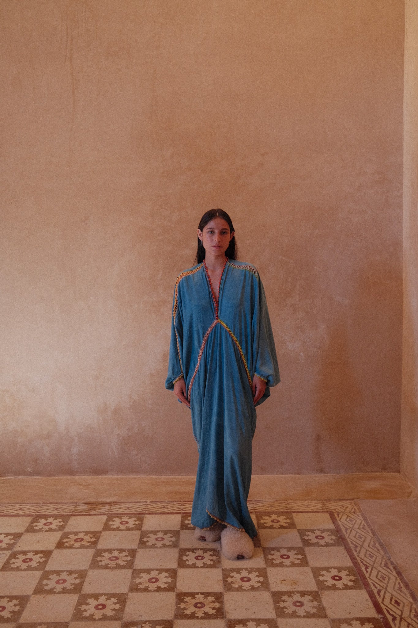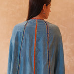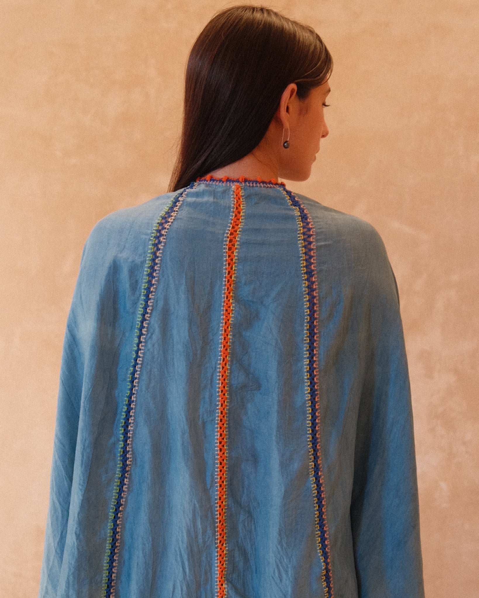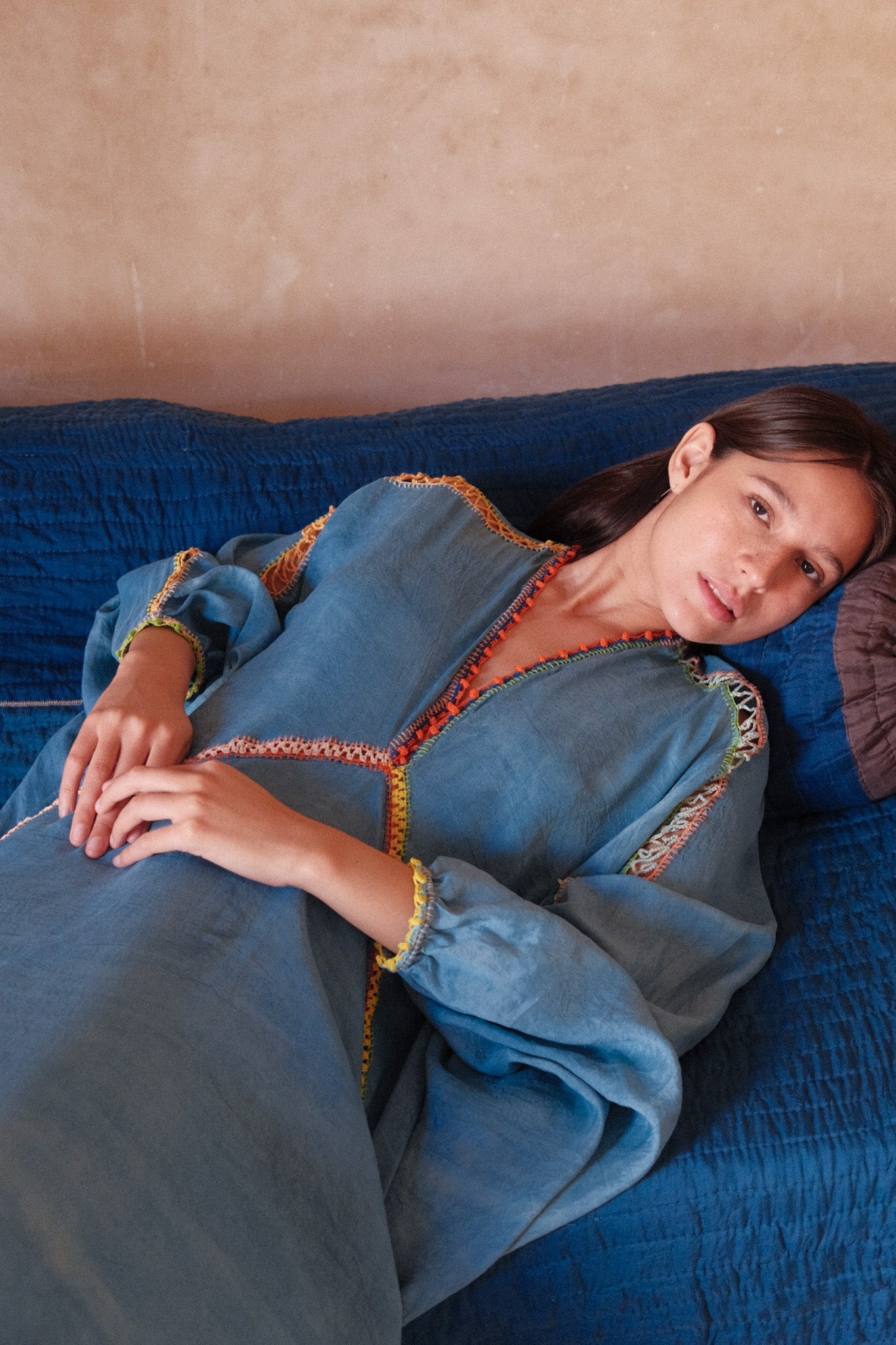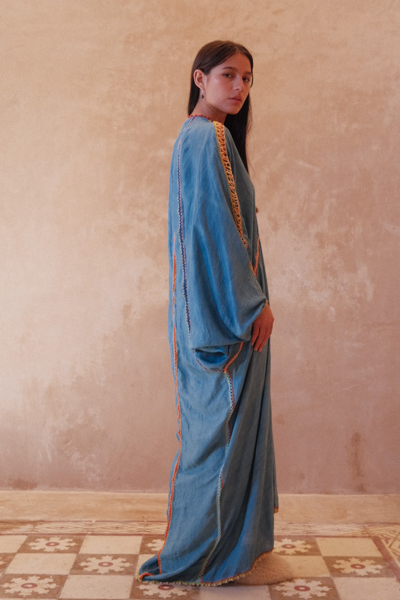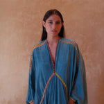 Cosima is new dress style. Inspired by the flutter and reach of a butterfly’s wings - the drape and fluidity of the Sari in India - the mystique and elegance of the Geishas of Japan. At the heart of it, the beauty and presence of women, something felt all over the world - and something we hope you’ll feel in this new style of kaftan. Crafted from almost 5 meters of natural dyed silk, expertly finished with crochet from Viki, we have a limited edition run of this new dress style. An open size, it effortlessly drapes on all body sizes and shapes and accentuates your body.