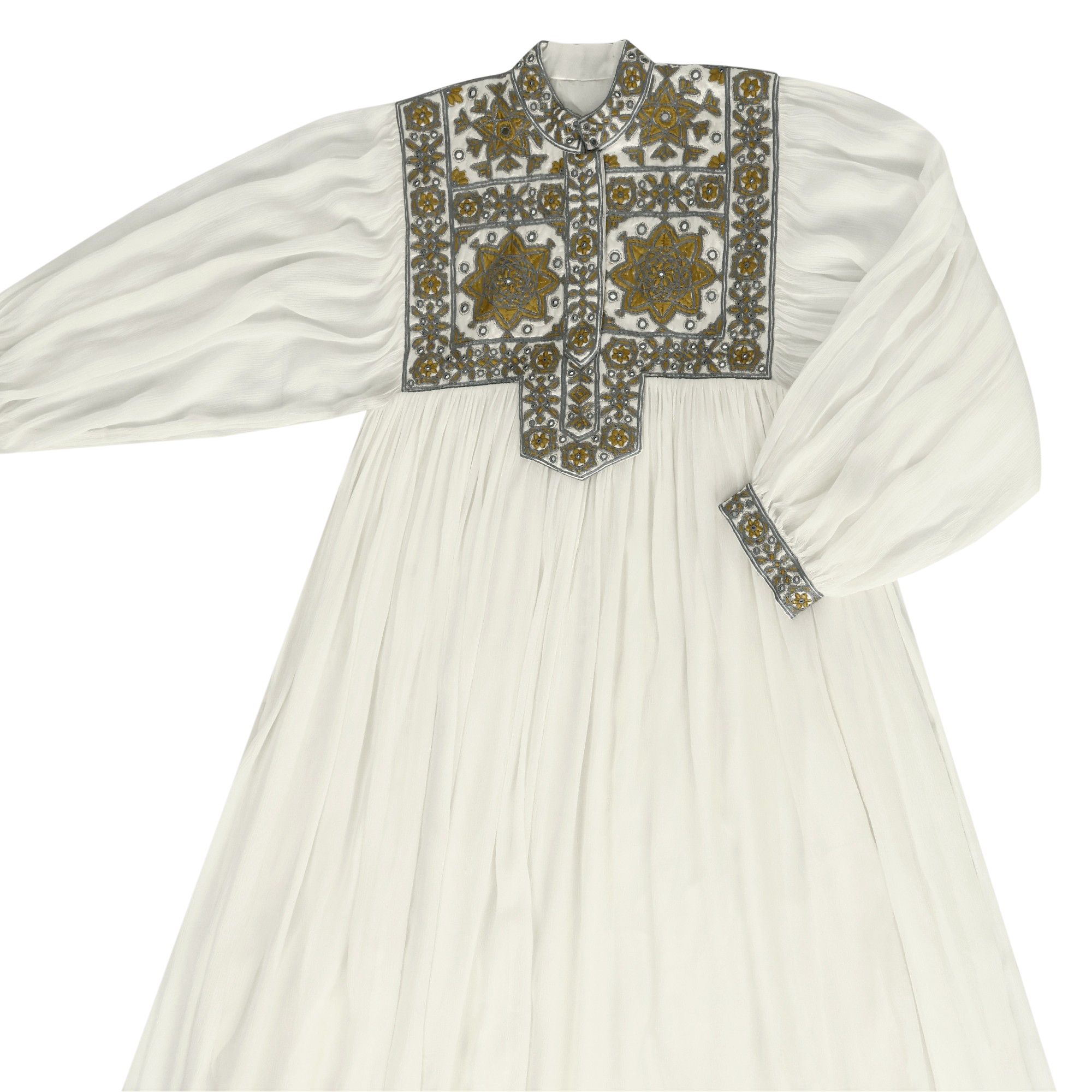 As light as a breeze and as delicate as silk, adorned with captivating mirrorwork embroidery that narrates tales of living history, the Delfina dress is a testament to tradition and craftsmanship. Developed through a unique collaboration between supernaturae and two desert tribes of Kutch, Gujarat, it embodies the spirit of cultural heritage.