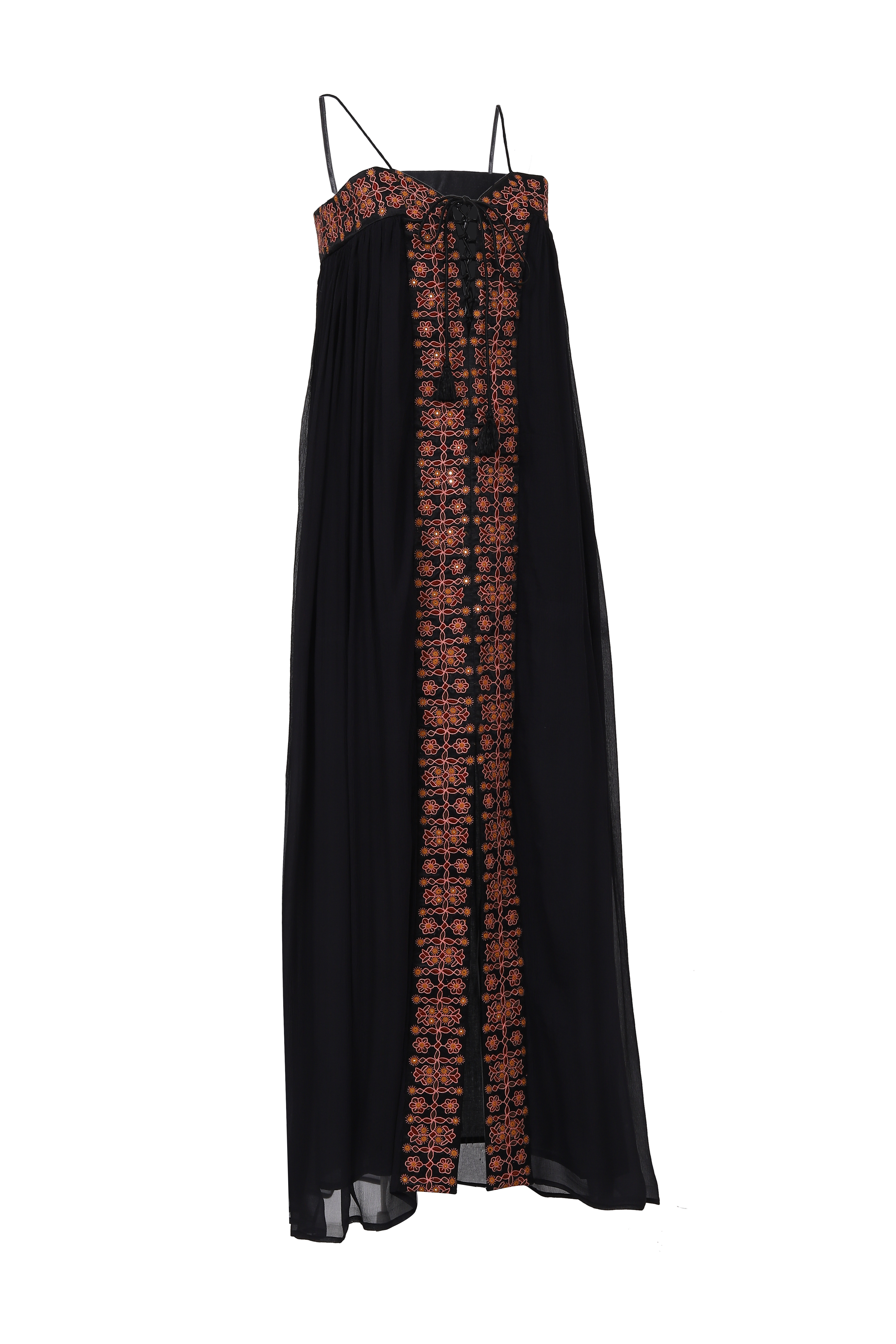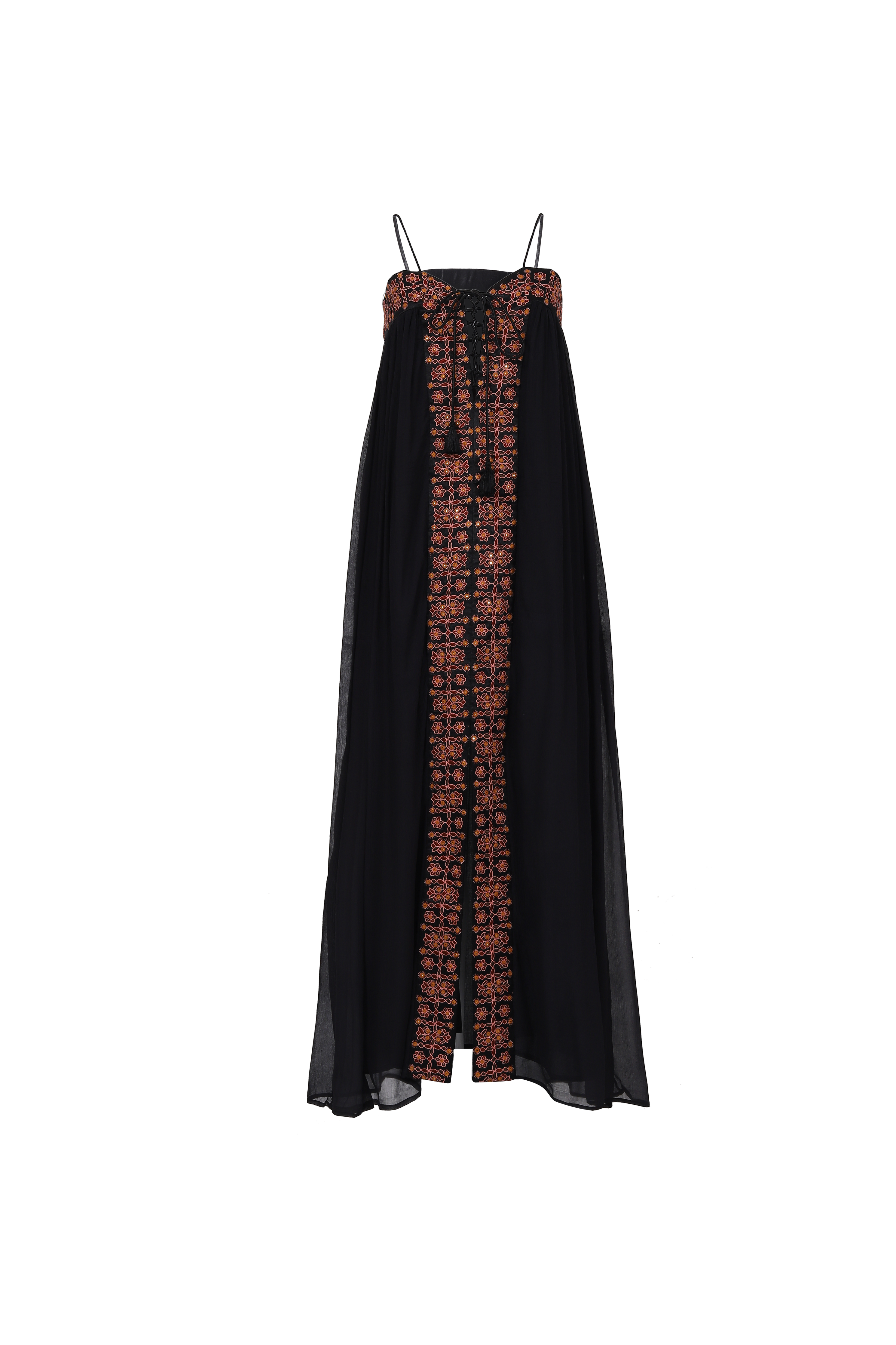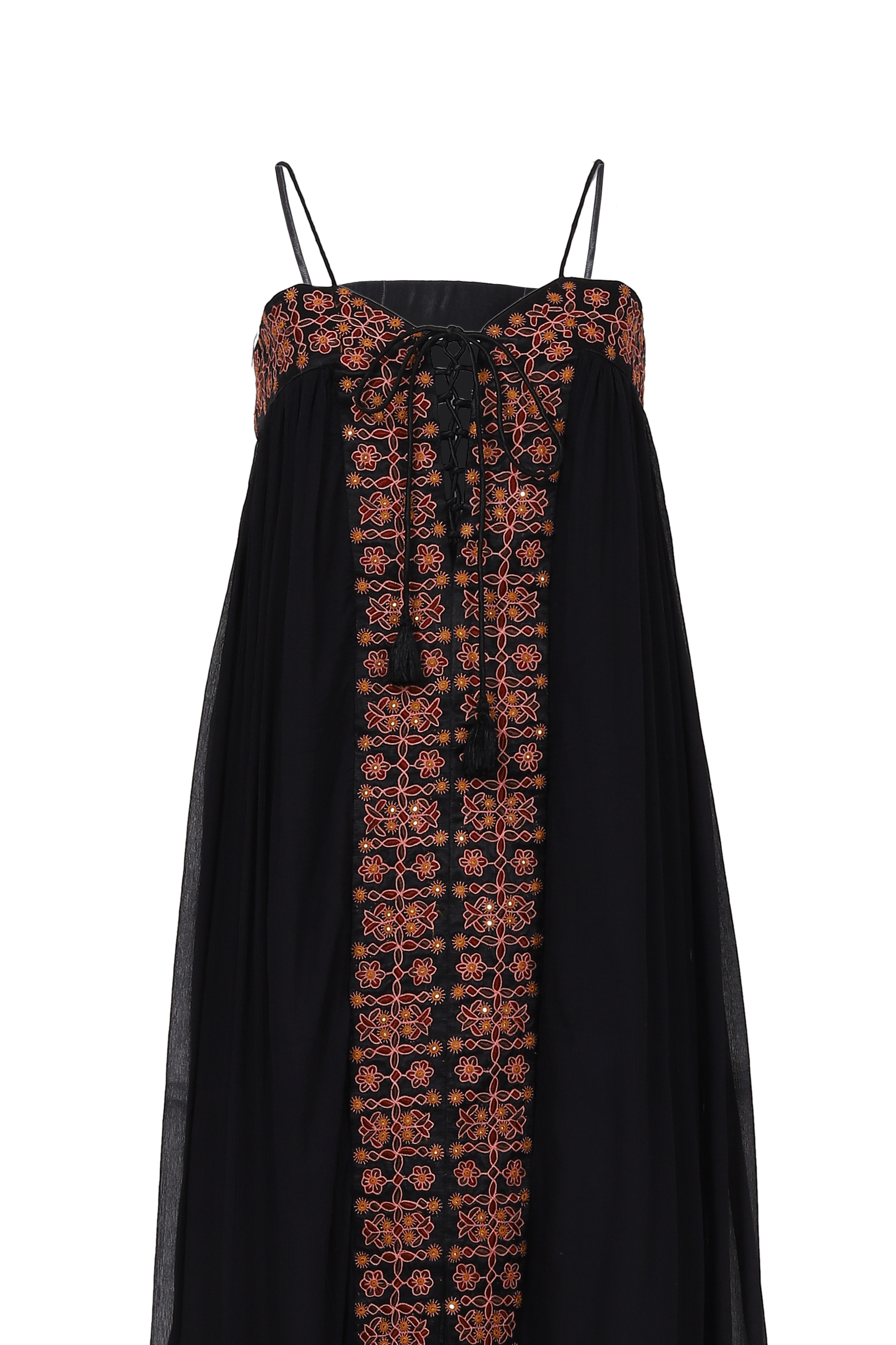 Crafted from pure silk chiffon, Flor is developed sustainably through a unique collaboration between supernaturae and two desert tribes of Kutch, Gujarat. It is the sleeveless version of our beloved Delfina. A testament to tradition, craftsmanship and cultural heritage – adorned with captivating mirrorwork embroidery that narrates tales of living history.