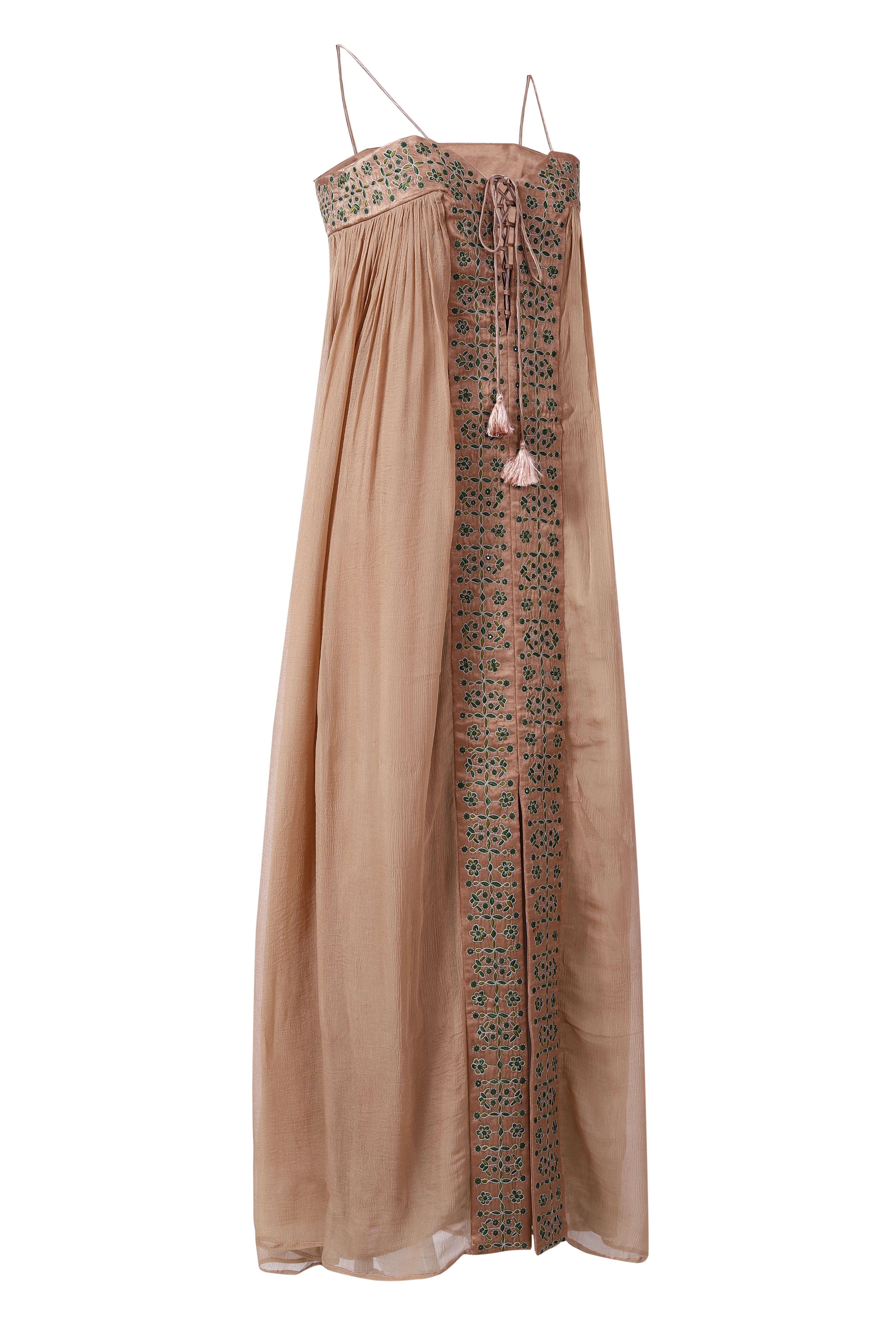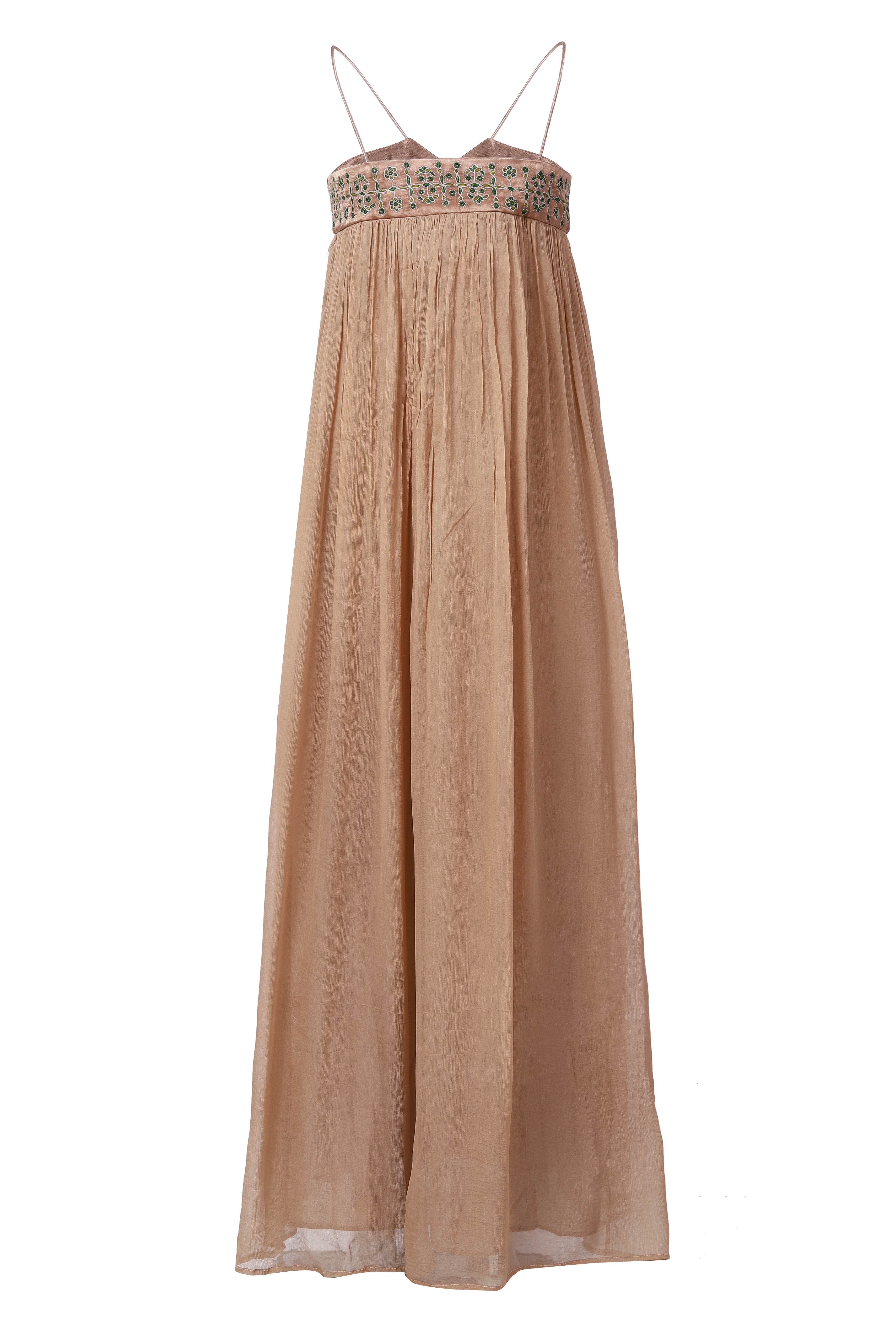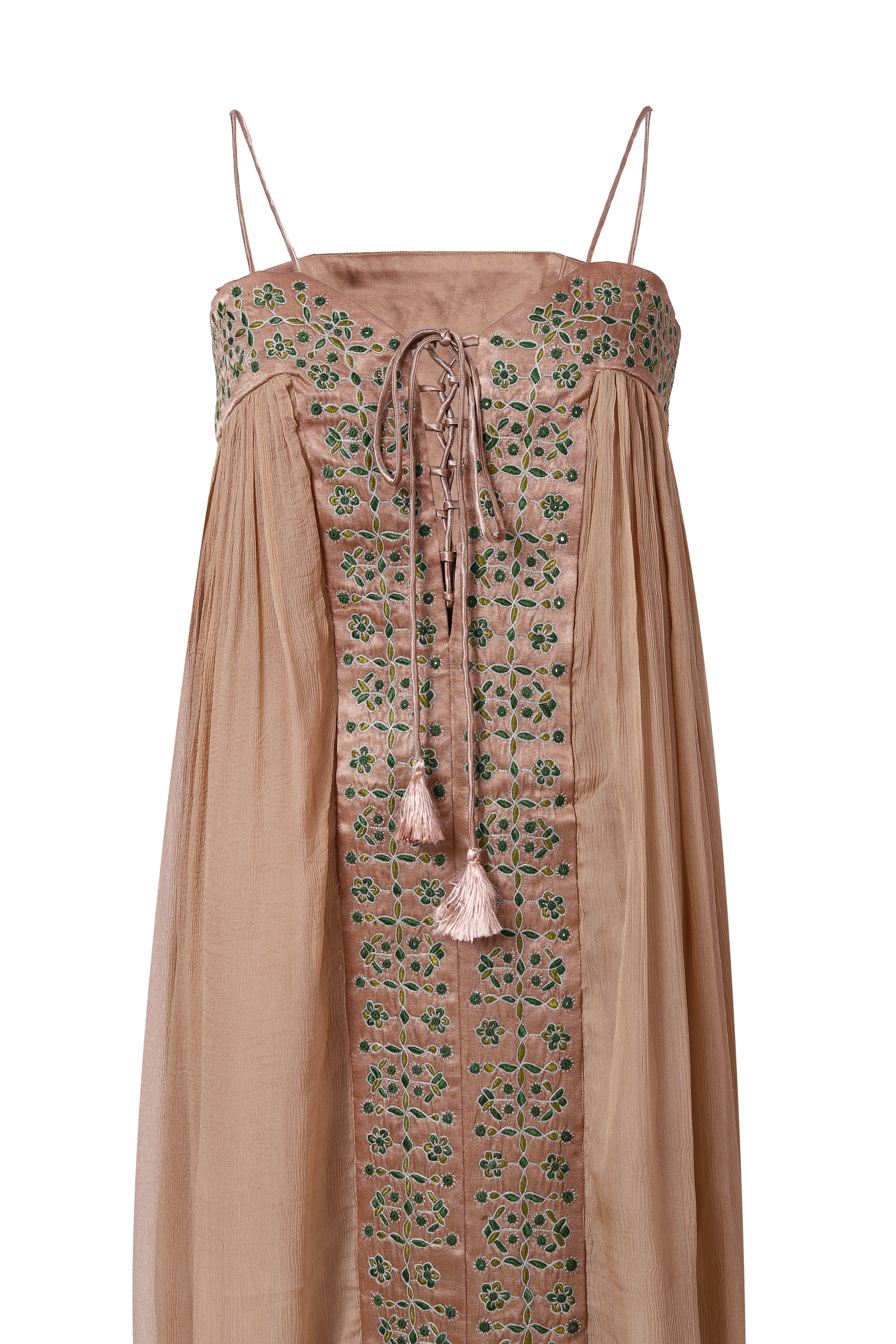 Crafted from pure silk chiffon, Flor is developed sustainably through a unique collaboration between supernaturae and two desert tribes of Kutch, Gujarat. It is the sleeveless version of our beloved Delfina. A testament to tradition, craftsmanship and cultural heritage – adorned with captivating mirrorwork embroidery that narrates tales of living history.
