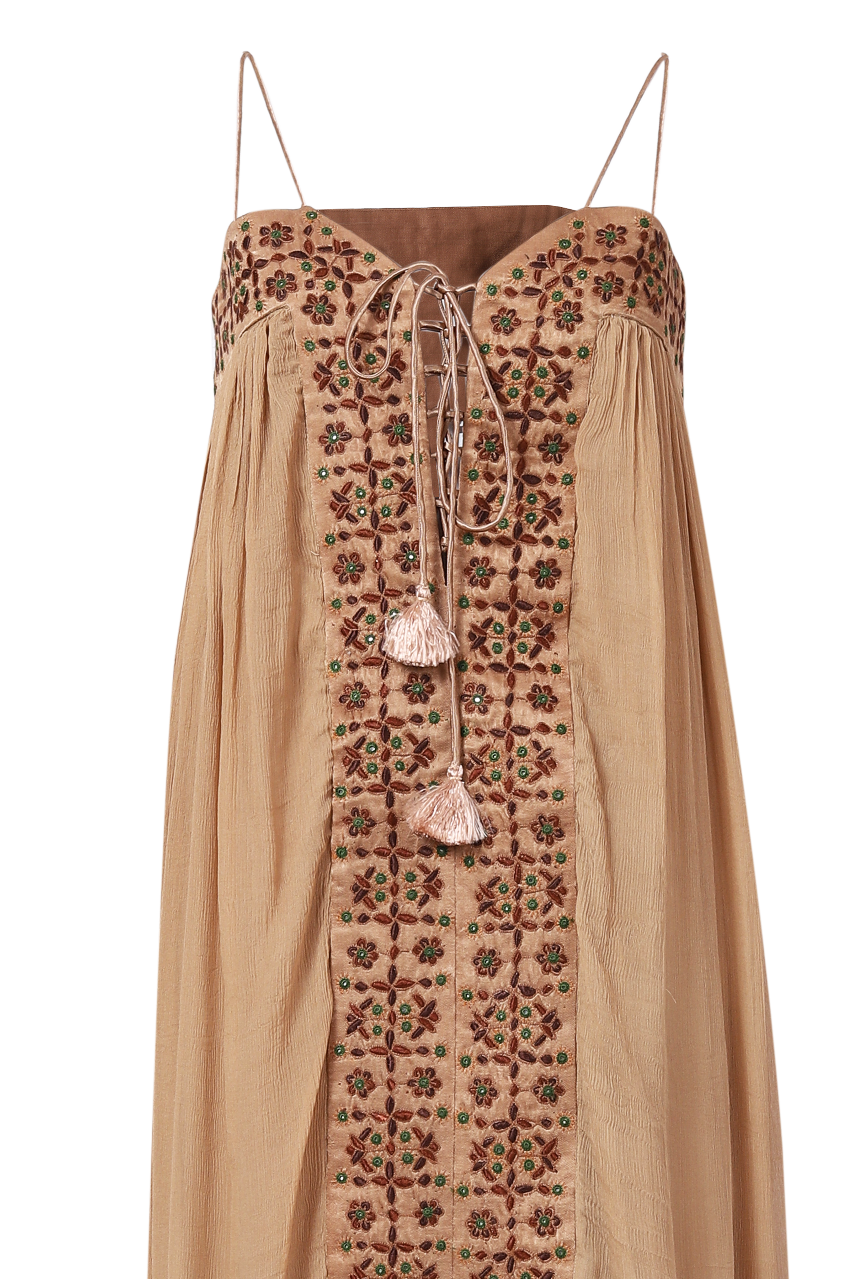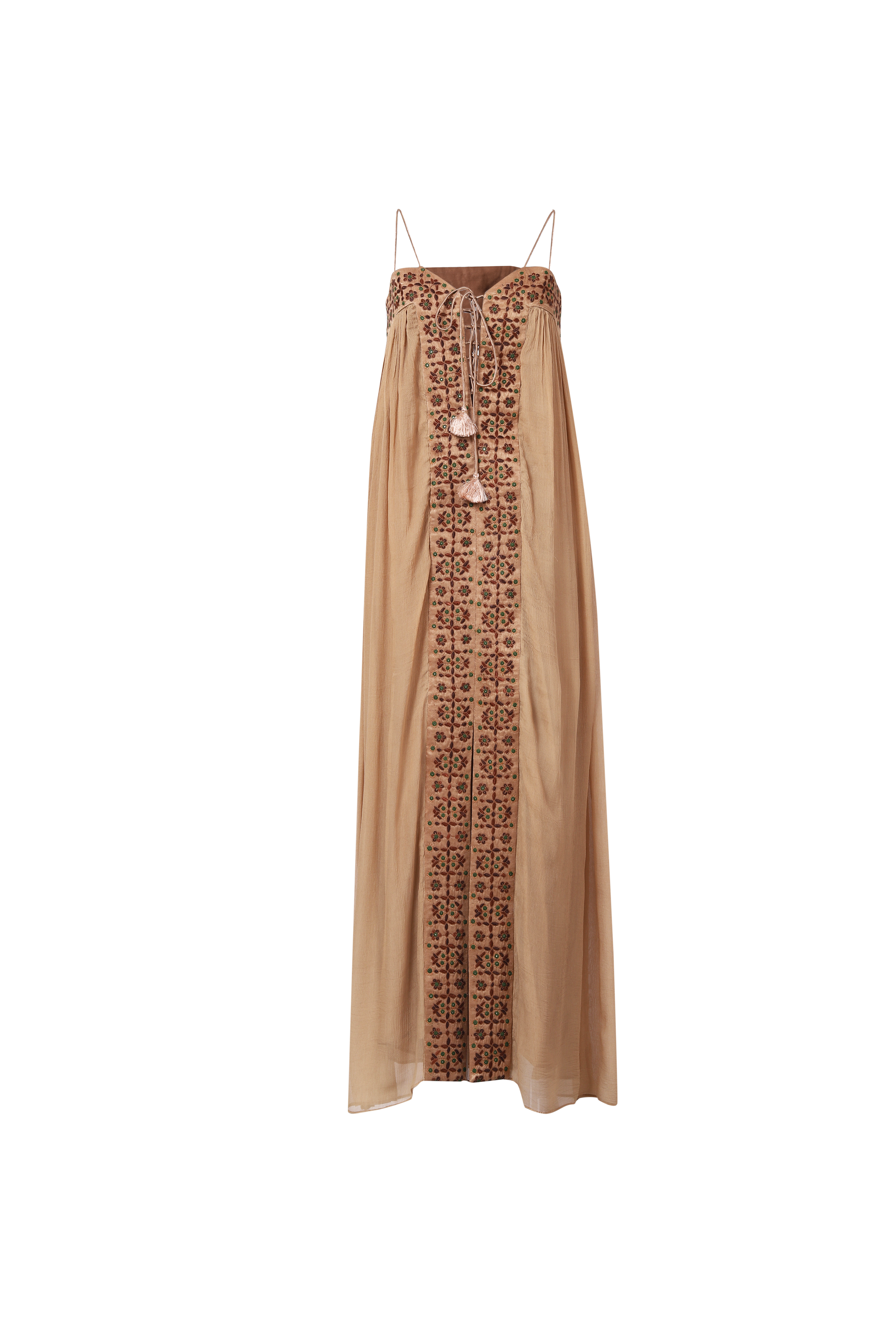 Adorned with delicate embroidery cascading from the bust tie, our Flor dress is the perfect luxury resortwear for the vibrant days of summer.