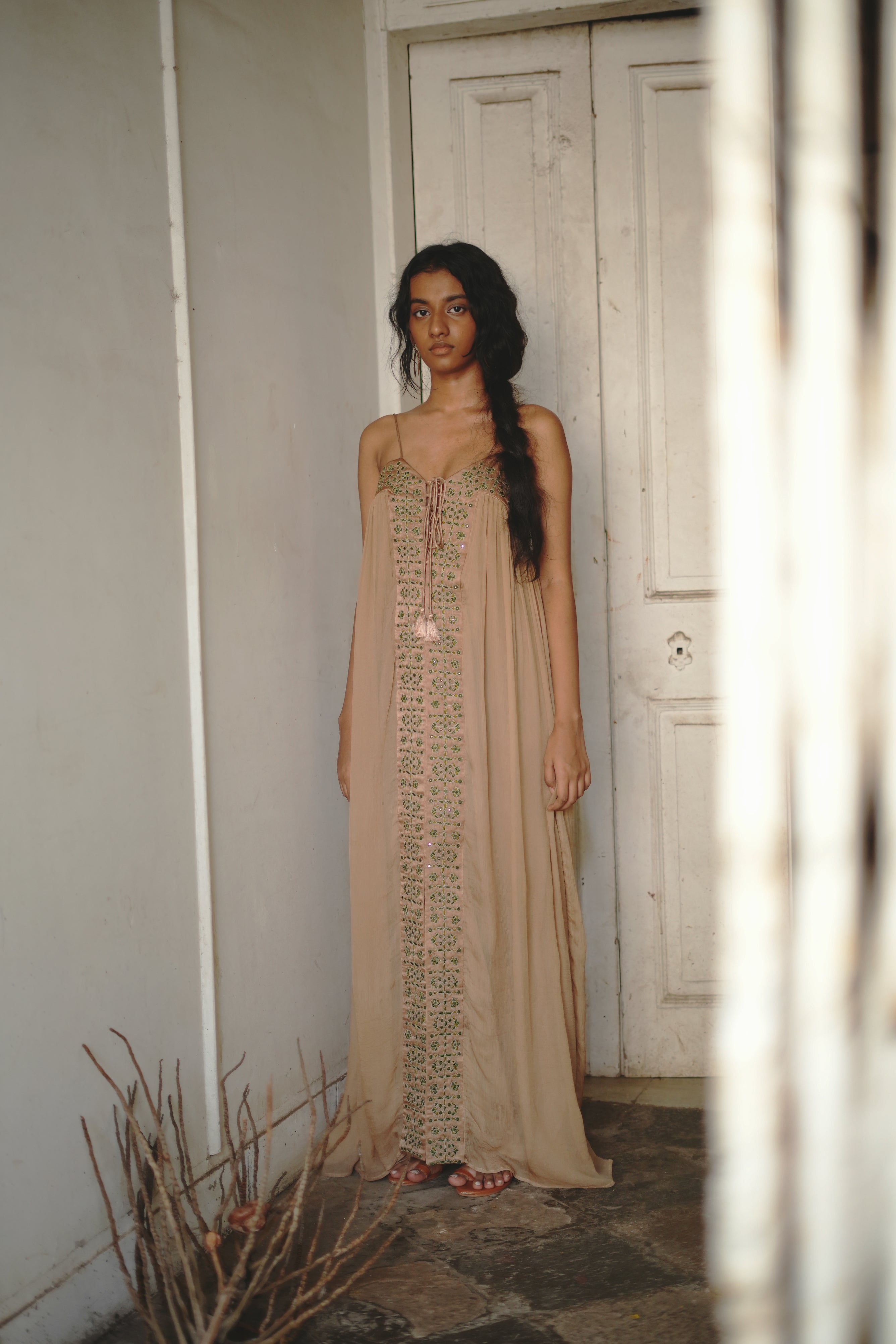 Crafted from pure silk chiffon, Flor is developed sustainably through a unique collaboration between supernaturae and two desert tribes of Kutch, Gujarat. It is the sleeveless version of our beloved Delfina. A testament to tradition, craftsmanship and cultural heritage – adorned with captivating mirrorwork embroidery that narrates tales of living history.