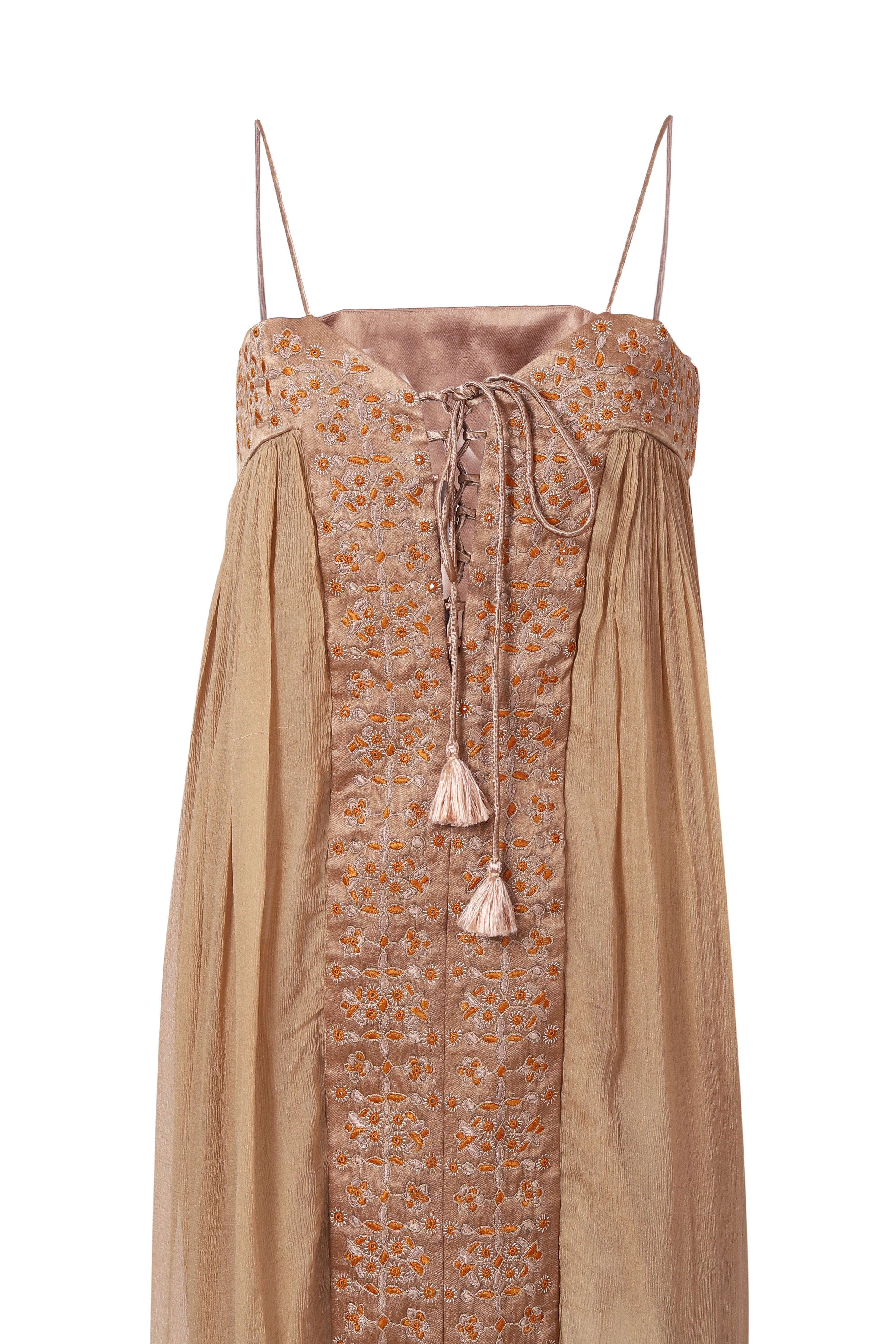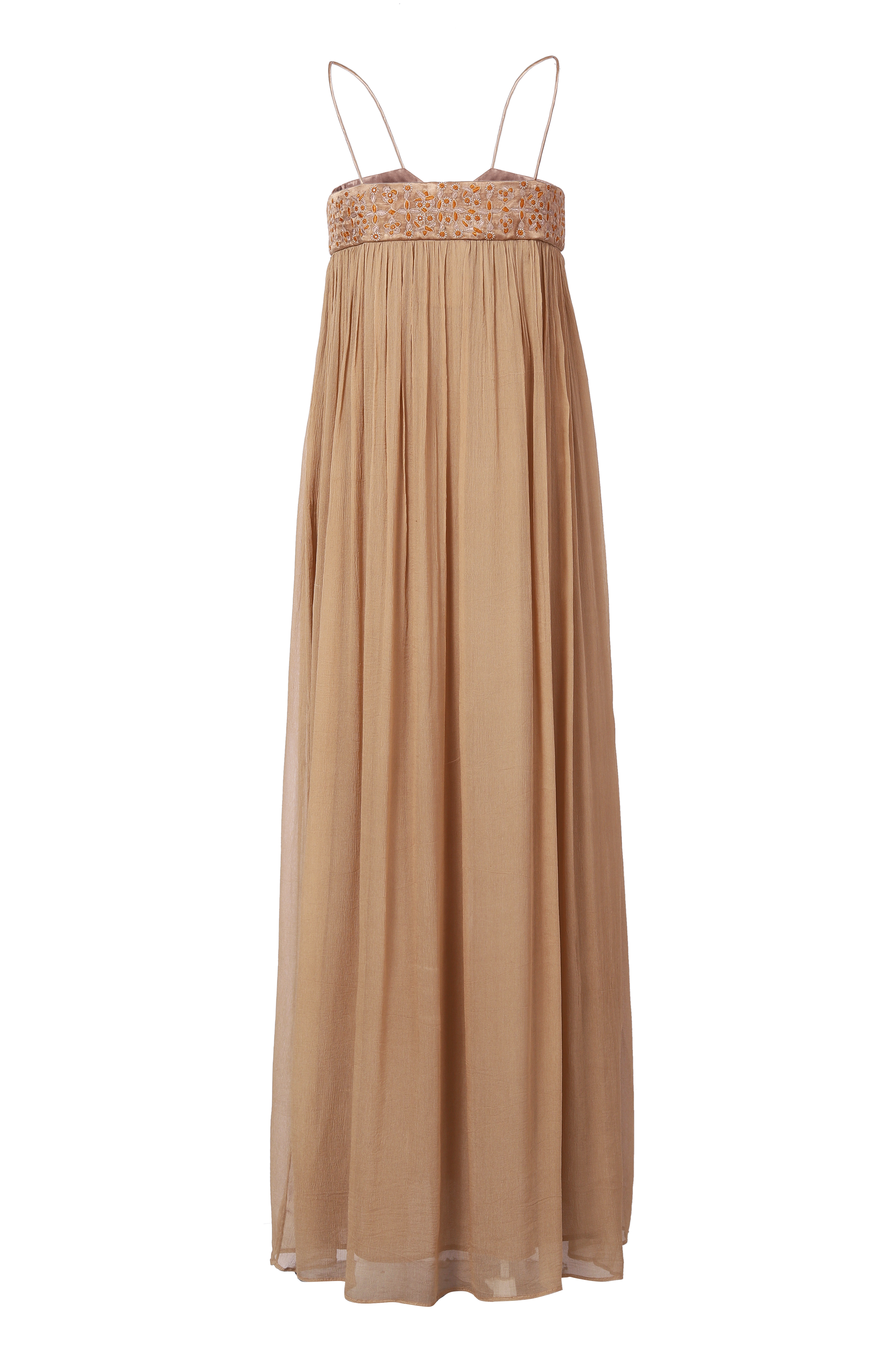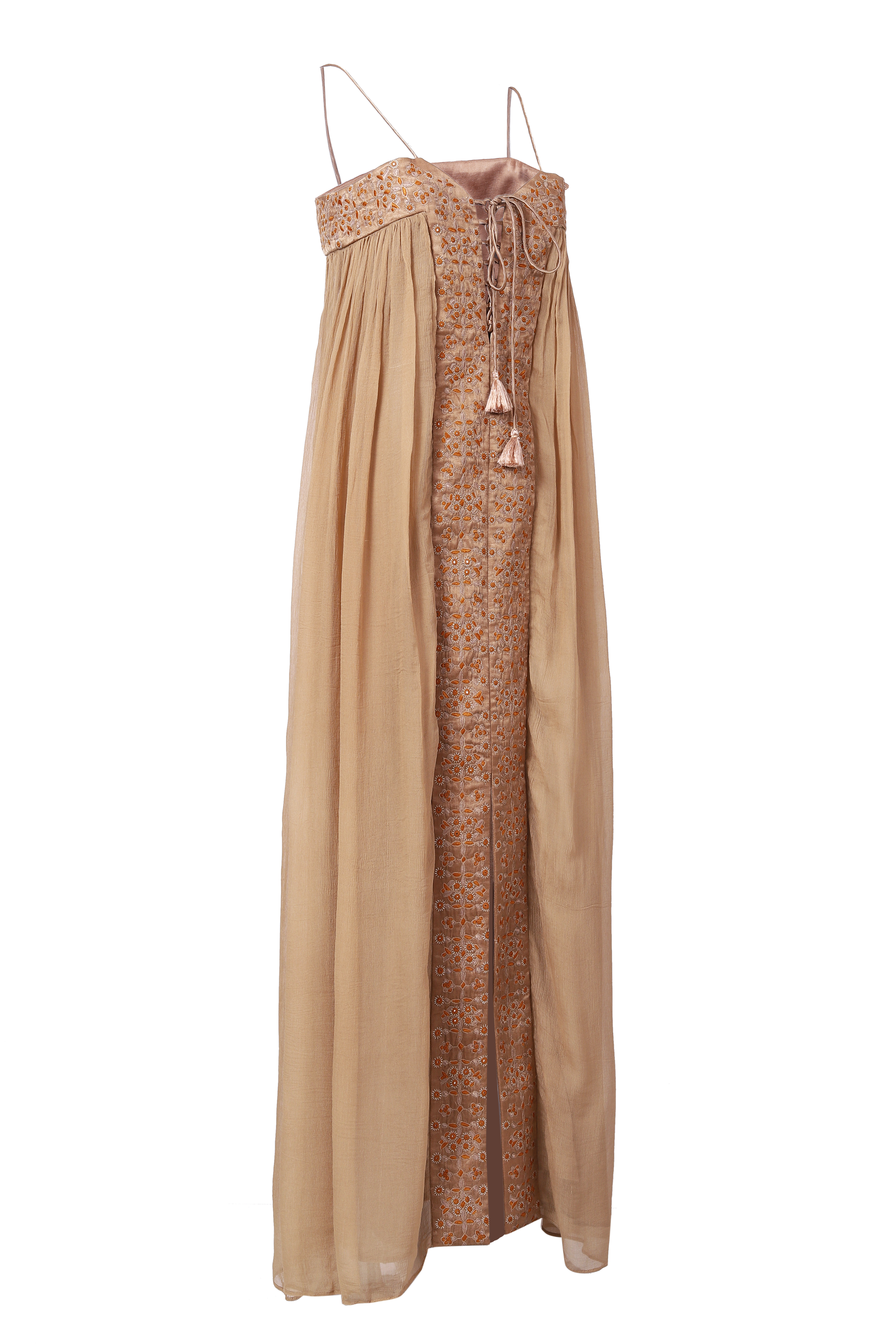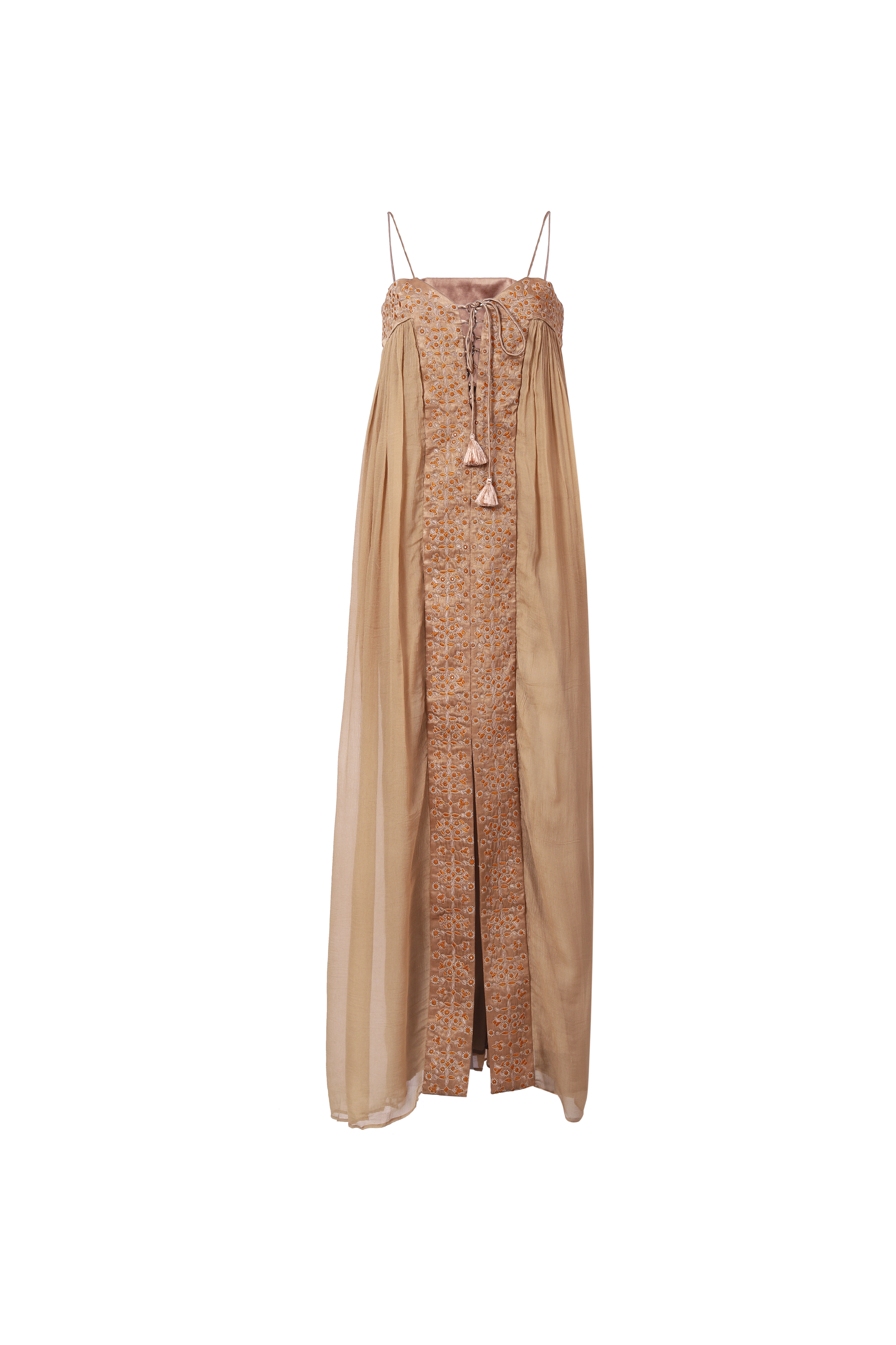 Crafted from pure silk chiffon, Flor is developed sustainably through a unique collaboration between supernaturae and two desert tribes of Kutch, Gujarat. It is the sleeveless version of our beloved Delfina. A testament to tradition, craftsmanship and cultural heritage – adorned with captivating mirrorwork embroidery that narrates tales of living history.