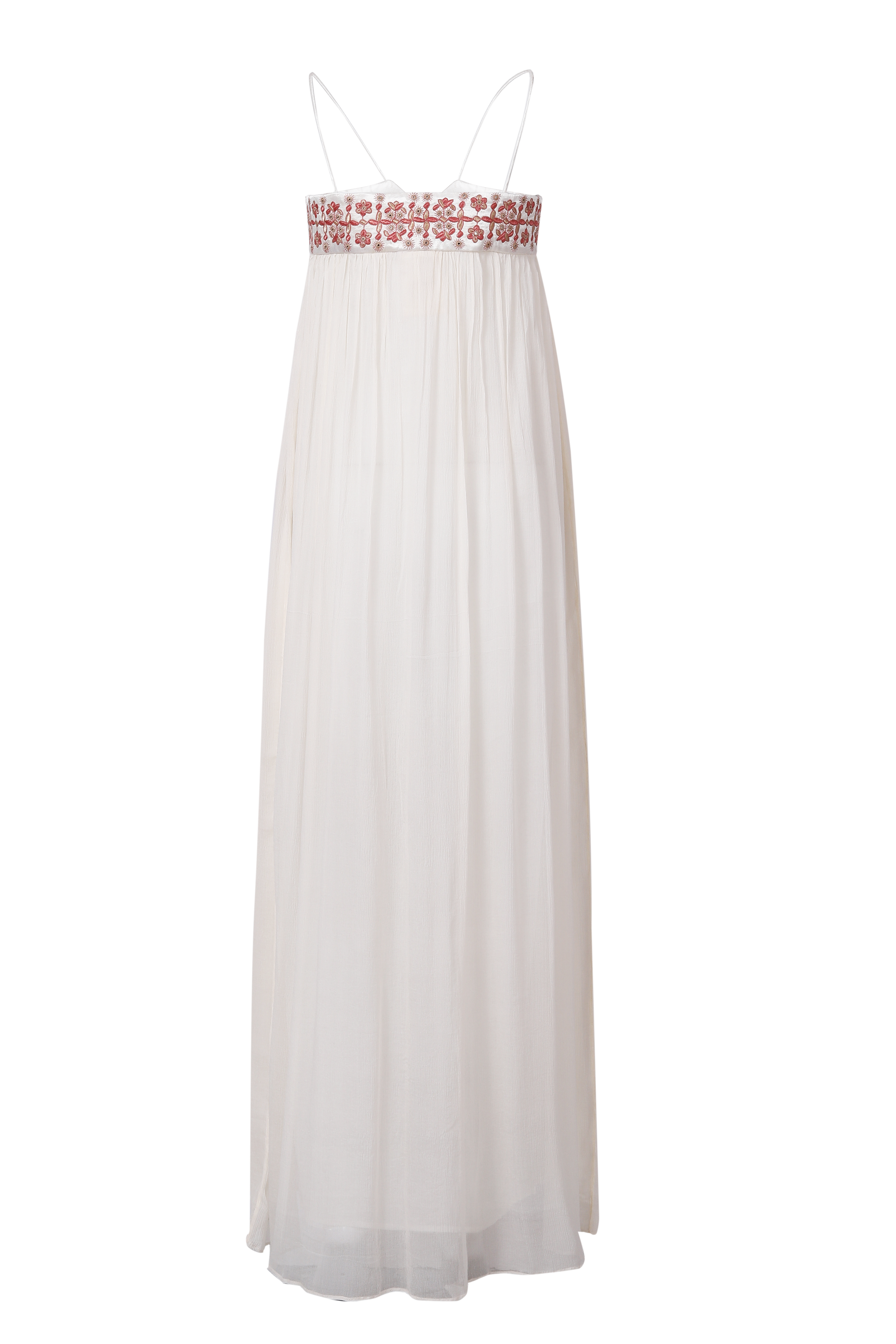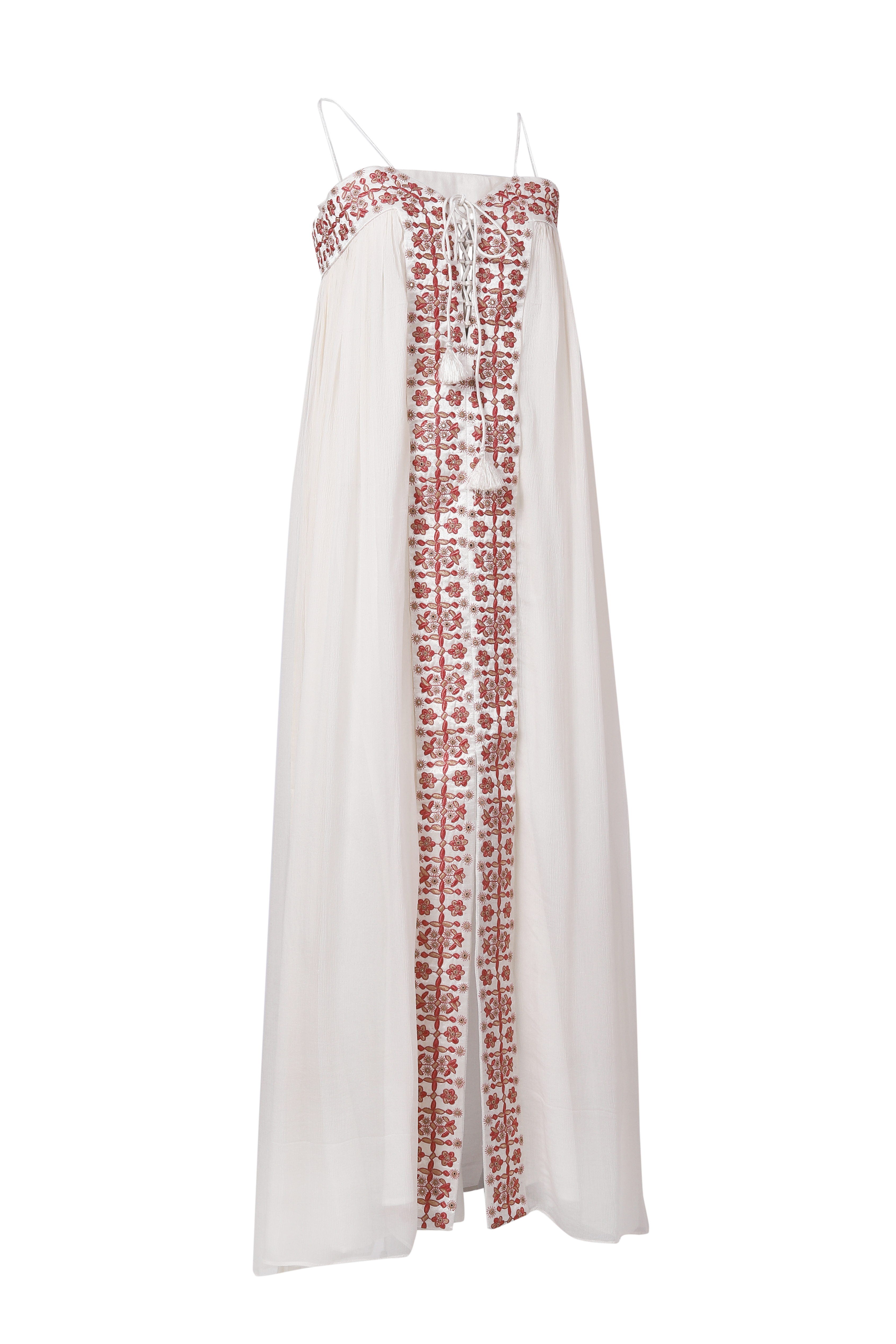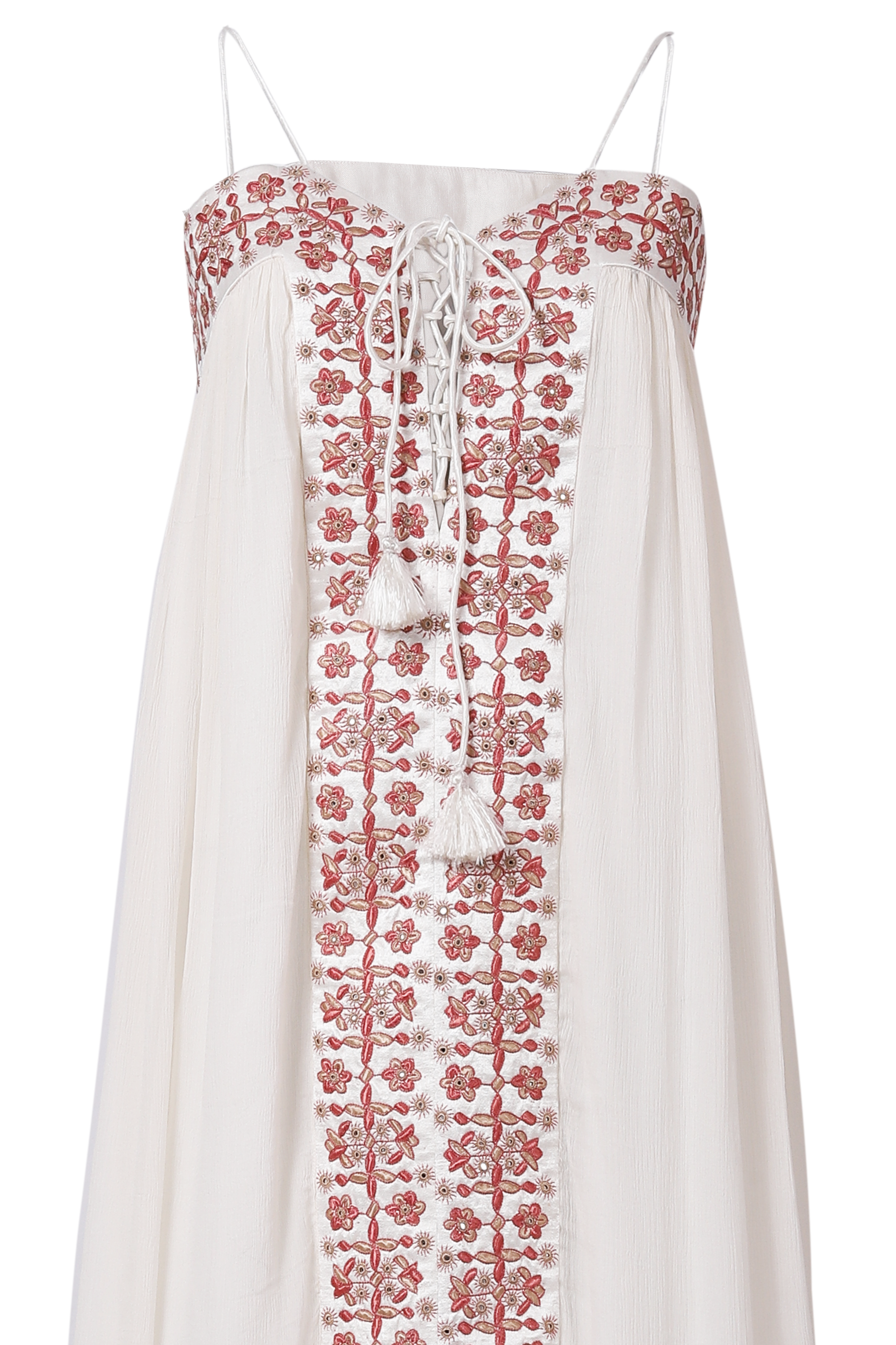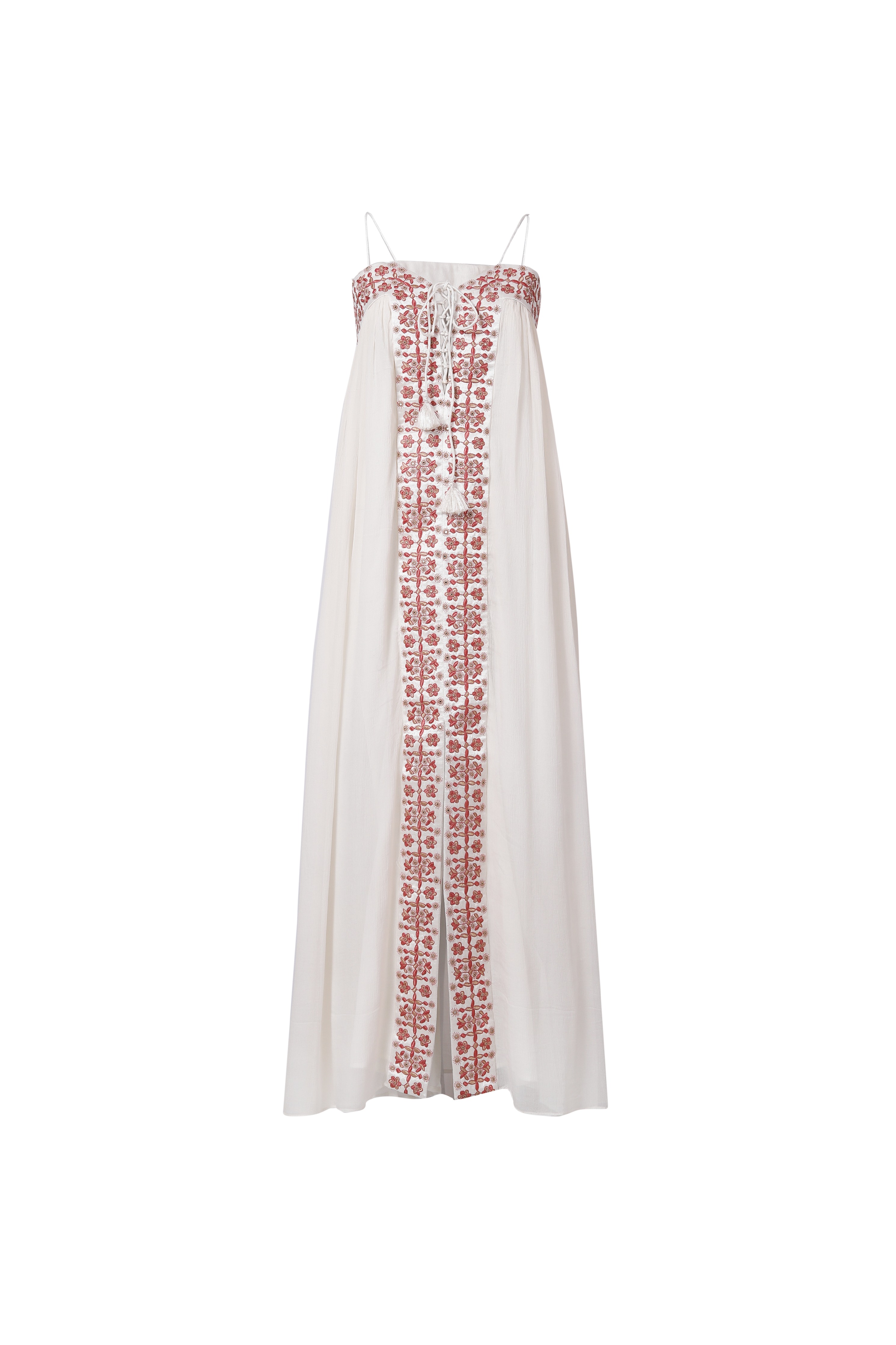 Adorned with delicate embroidery cascading from the bust tie, our Flor dress is the perfect luxury resortwear for the vibrant days of summer.