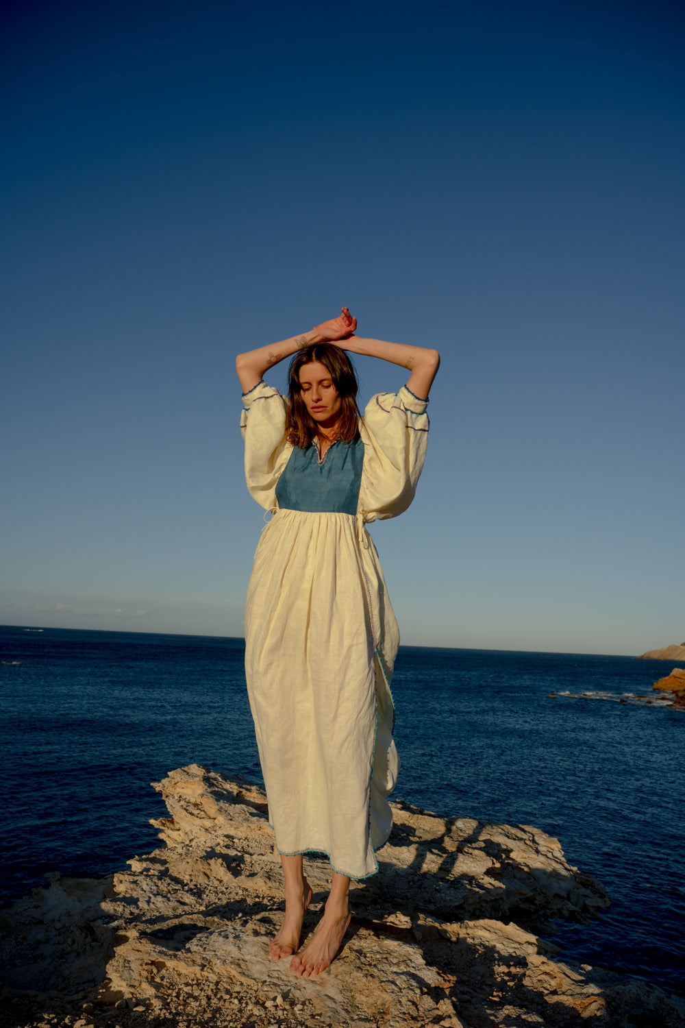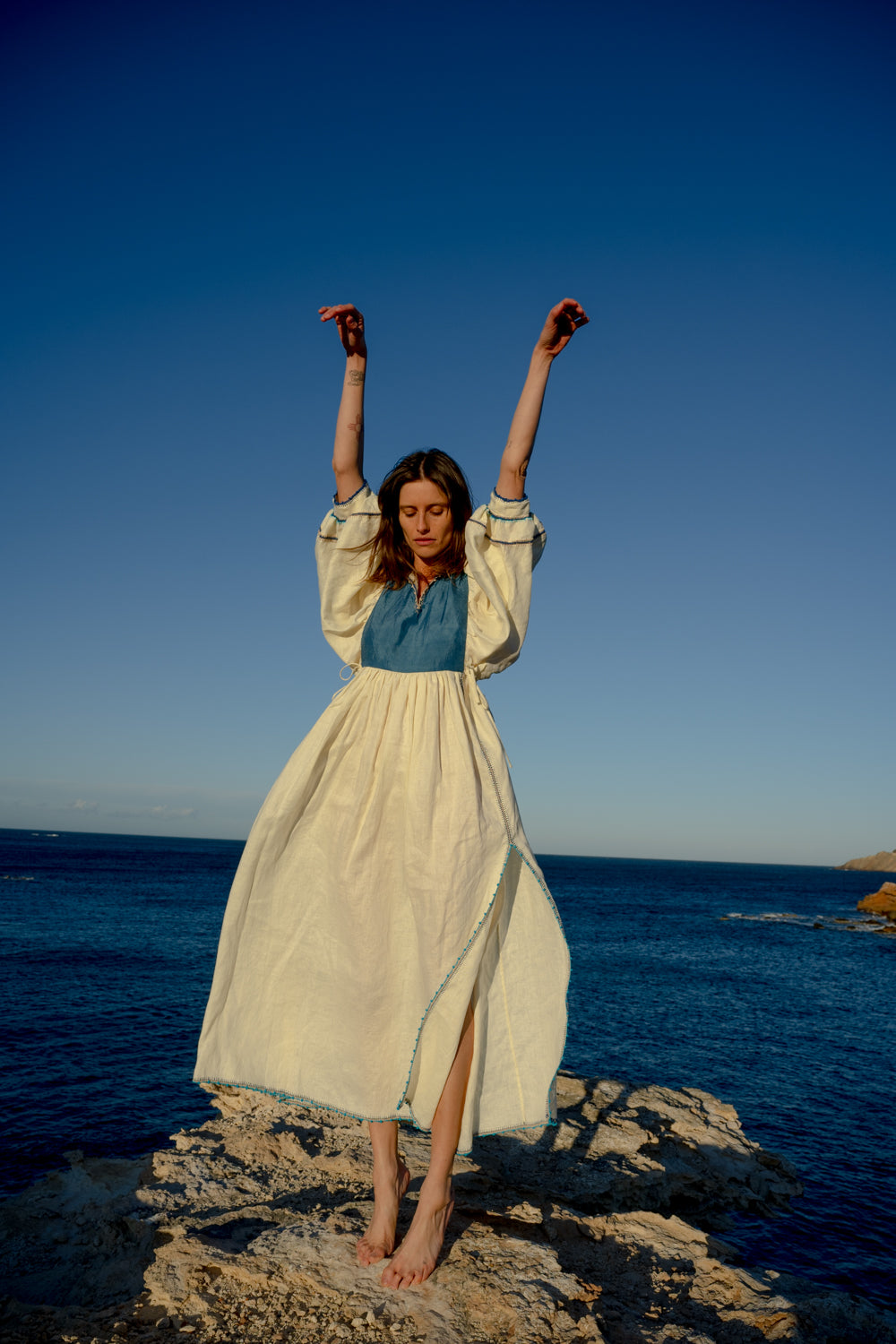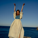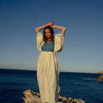 Introducing our limited edition Serafina Linen dresses, inspired by 1970s kaftans, ideal as luxury resort wear in all-natural fabrics. Crafted meticulously from the finest linen and handwoven, naturally dyed silk, these pieces offer a light, delicate feel against the skin.