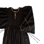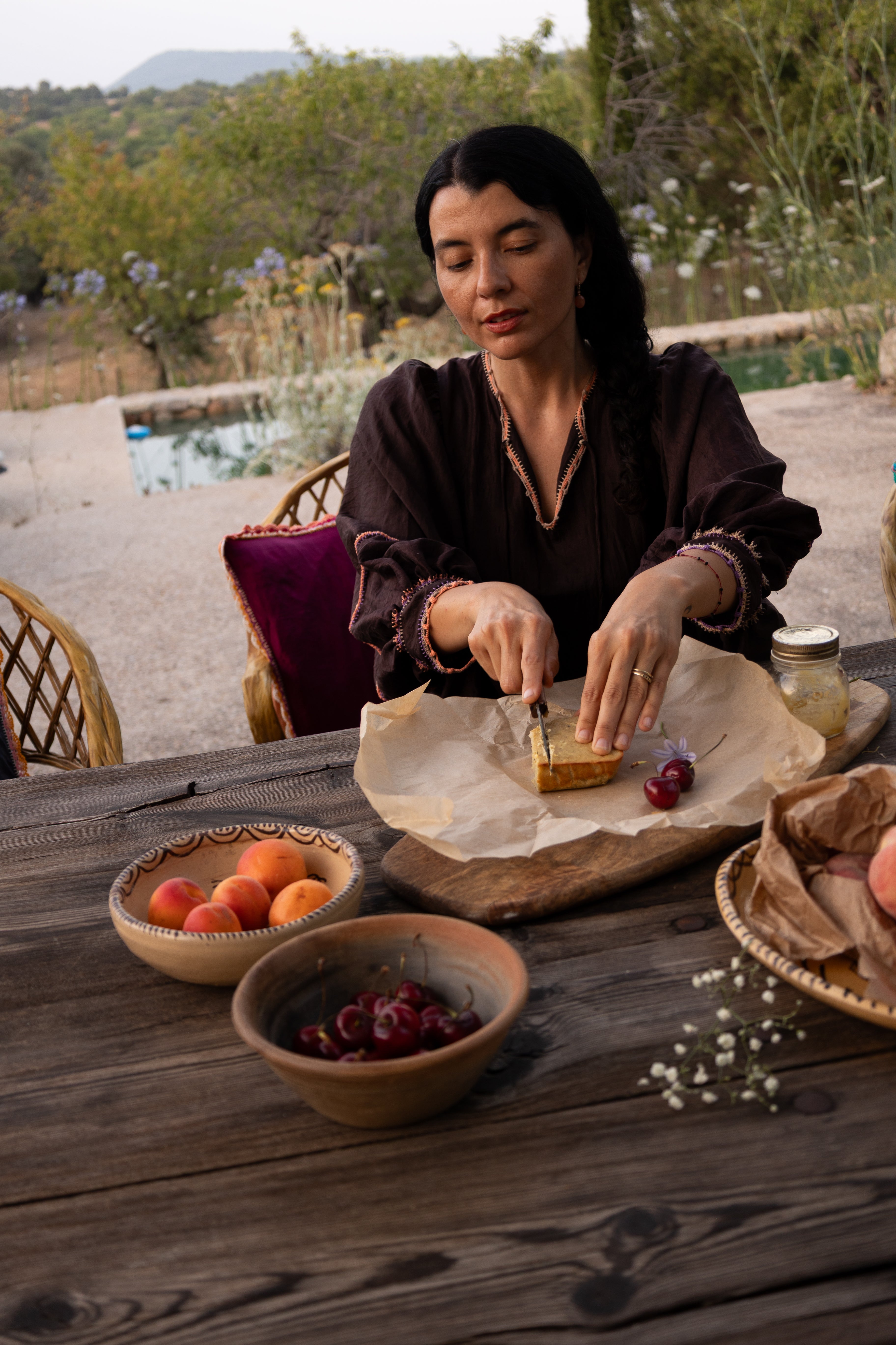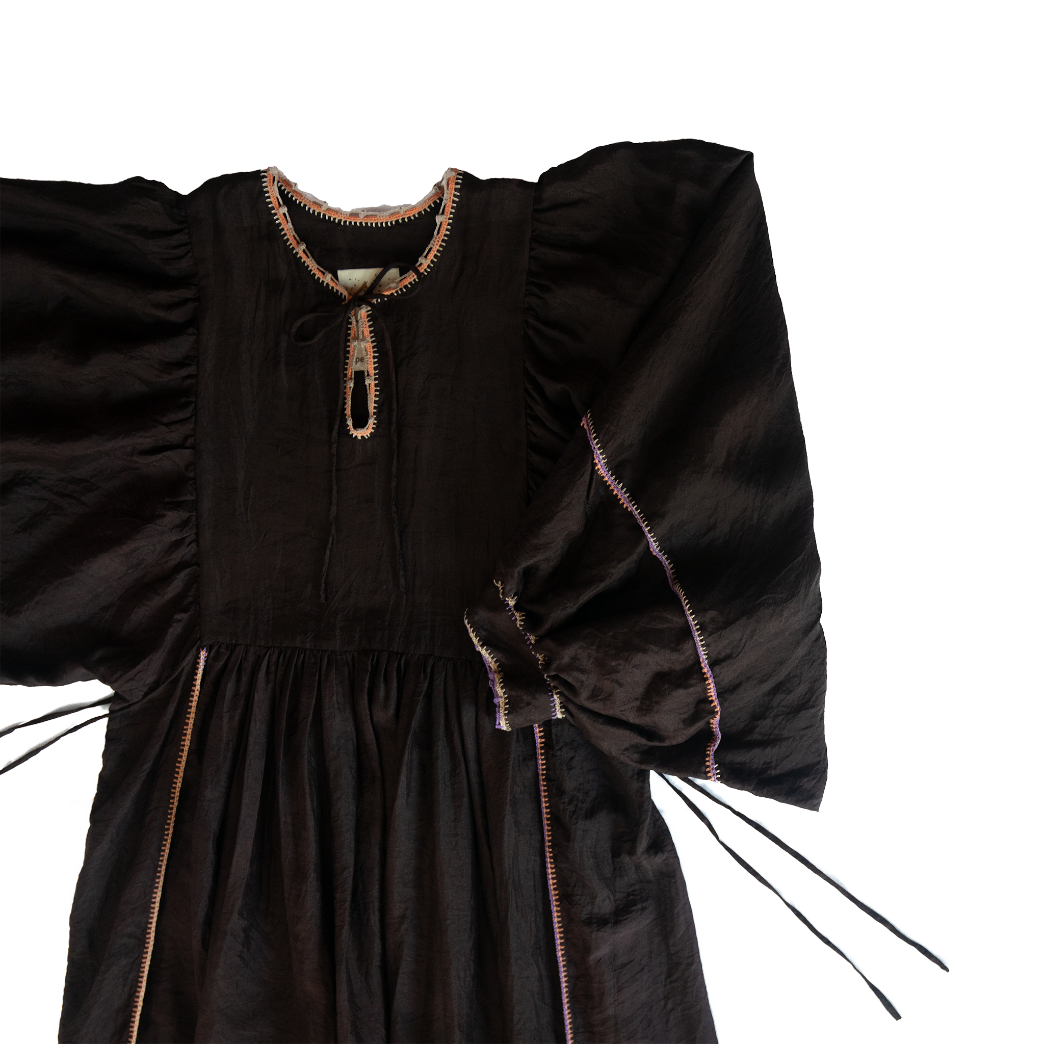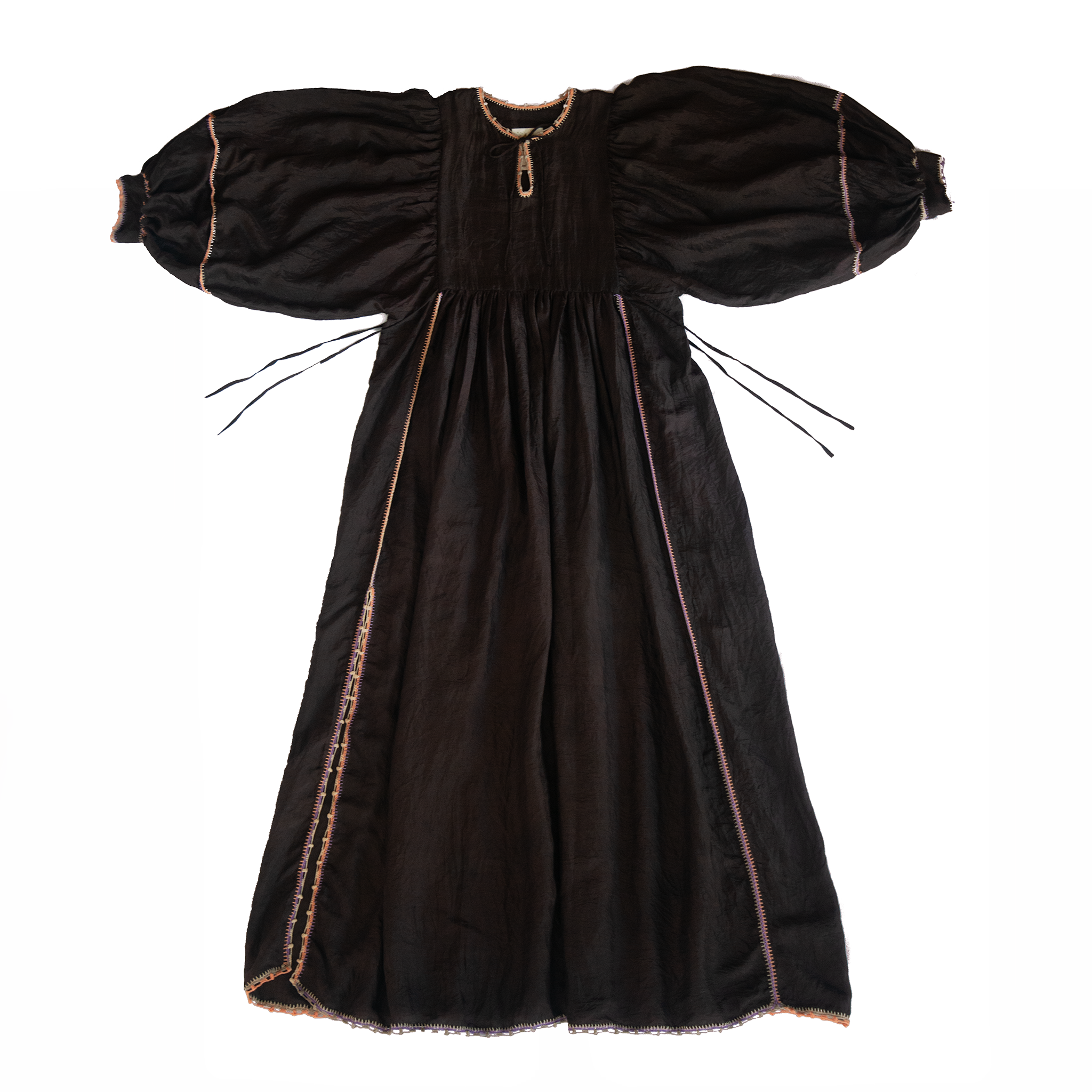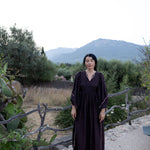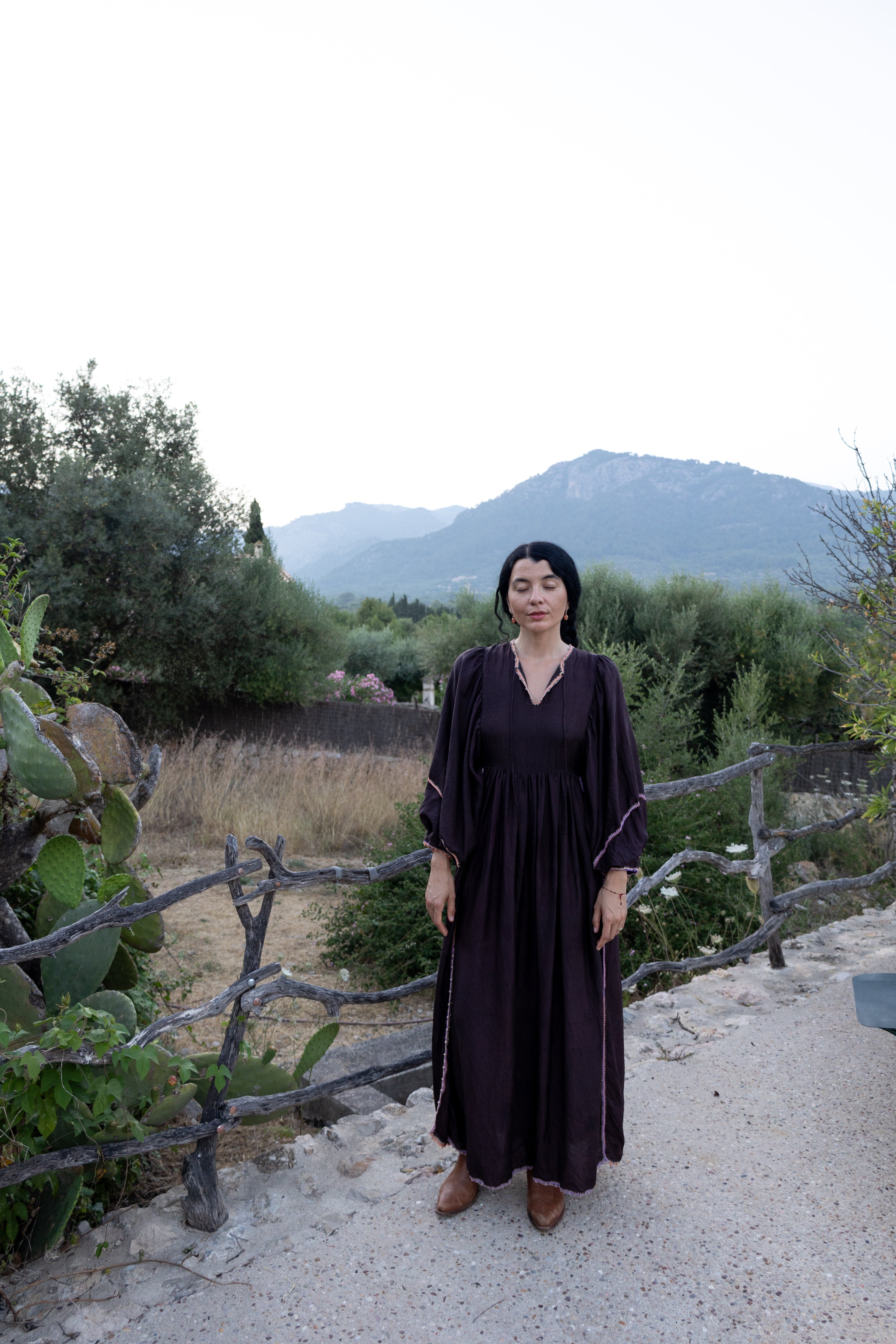 Introducing our Serafina dress, inspired by 1970s kaftans, ideal as luxury resort wear. Made from handwoven silk for a delicate and light feel to the skin. Developed over a year in collaboration with artisan groups in Oaxaca, our production process honors natural cycles, with silk woven, naturally dyed, and adorned with delicate crochet.